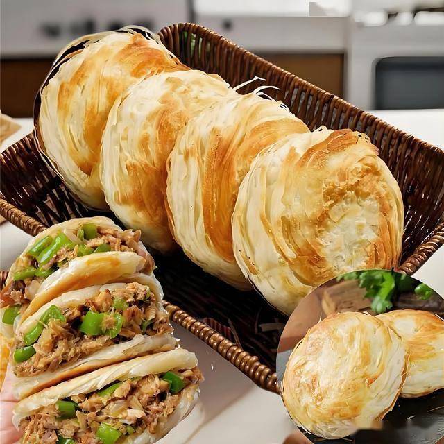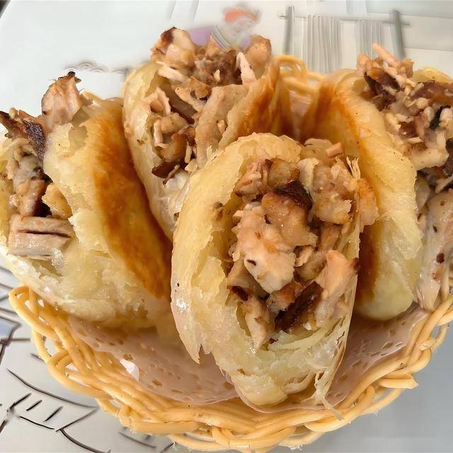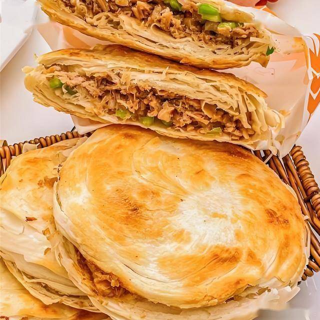 潼关肉夹馍最具辨识度的就是它的千层饼,外形饱满,色泽金黄,吃起来外皮酥脆,内里松软,咬一口直掉渣。与普通的肉夹馍不同,潼关肉夹馍的饼皮制作极为讲究,需经过抹油、卷面、揪剂子、擀饼等多道工序,最终形成层次分明的效果。