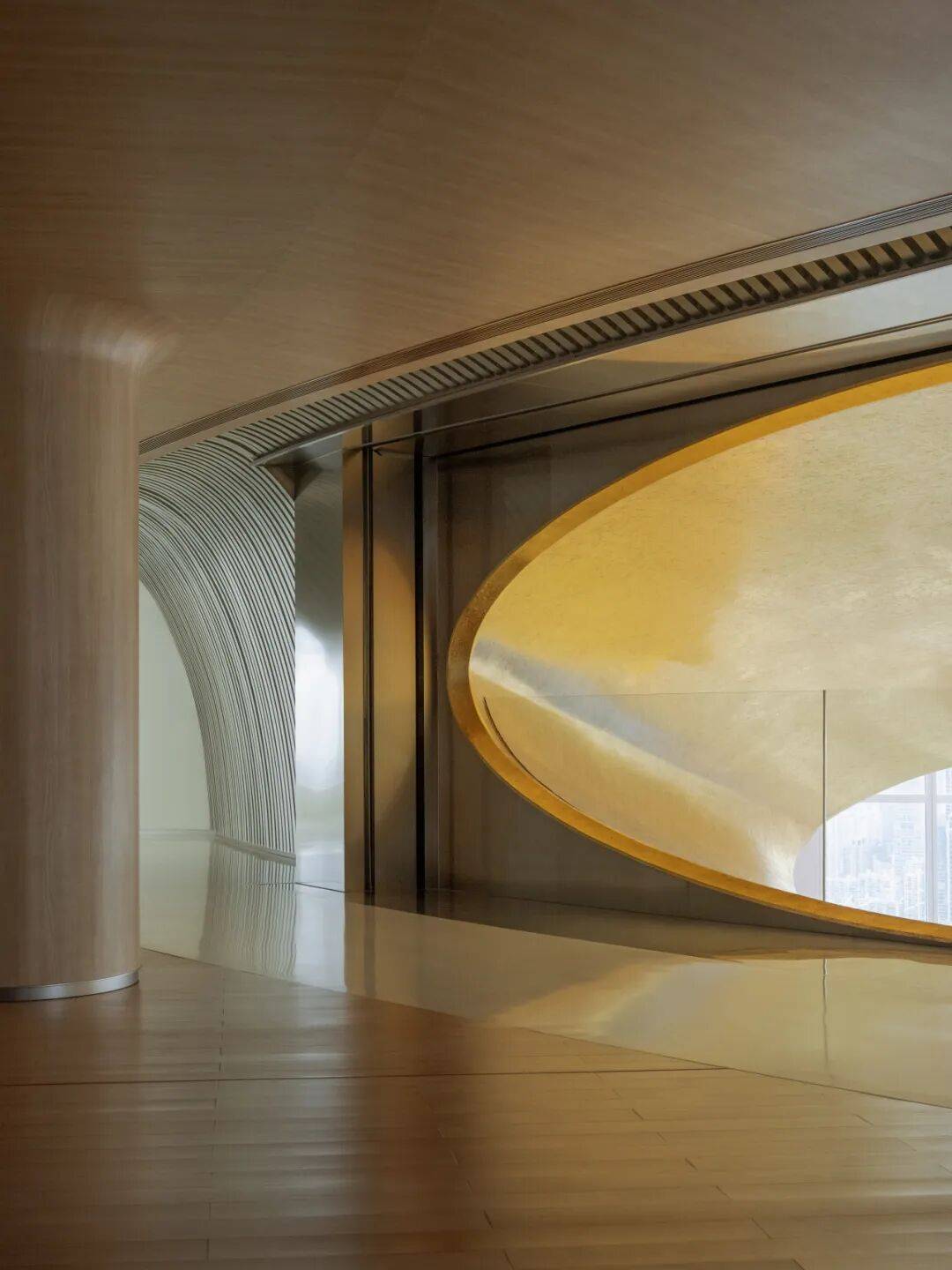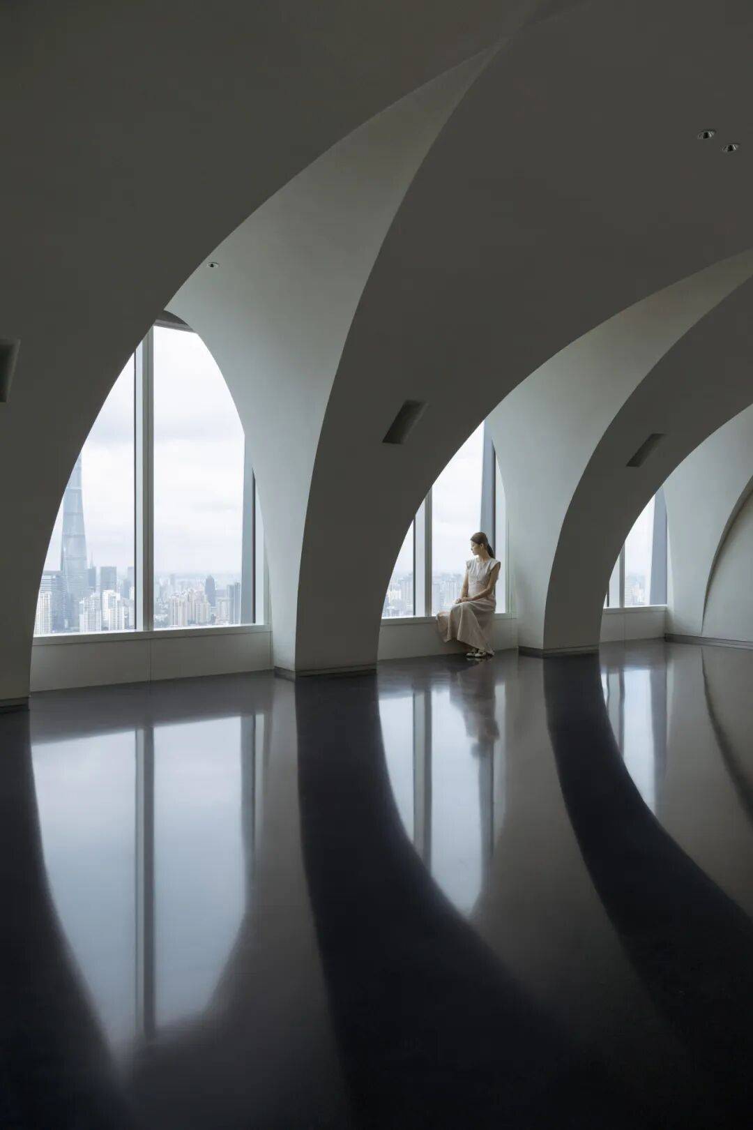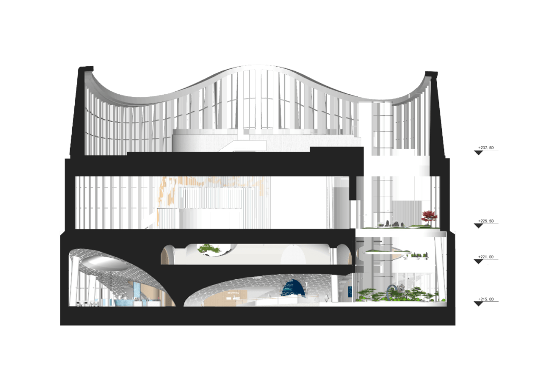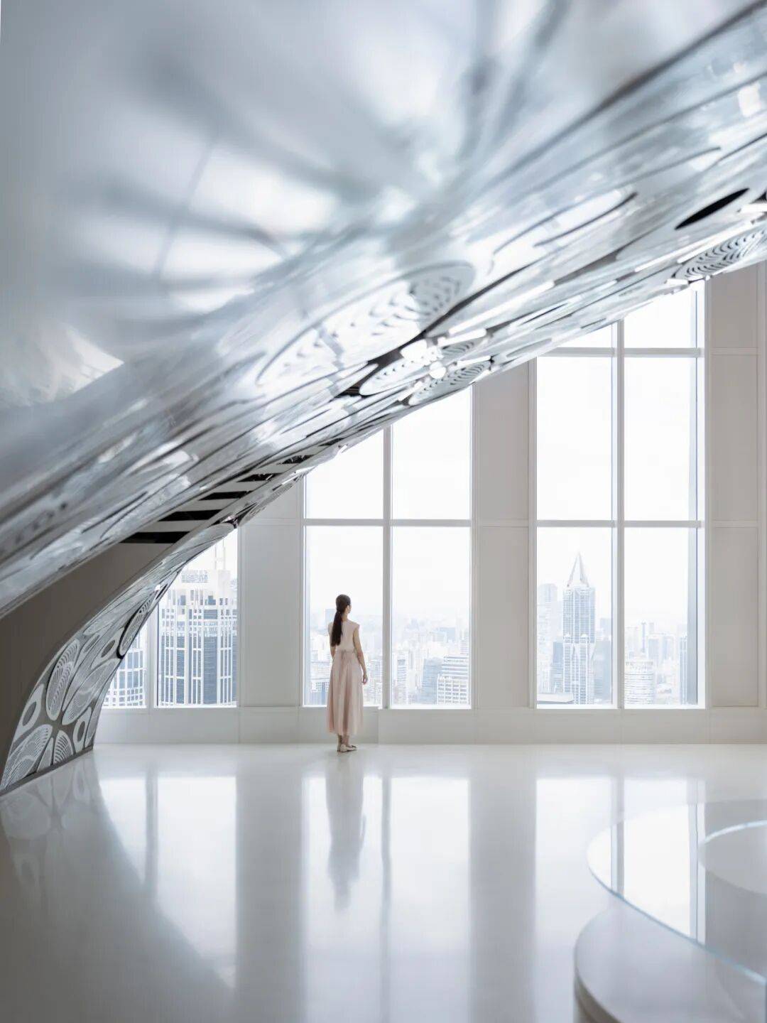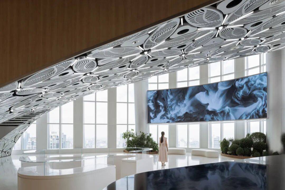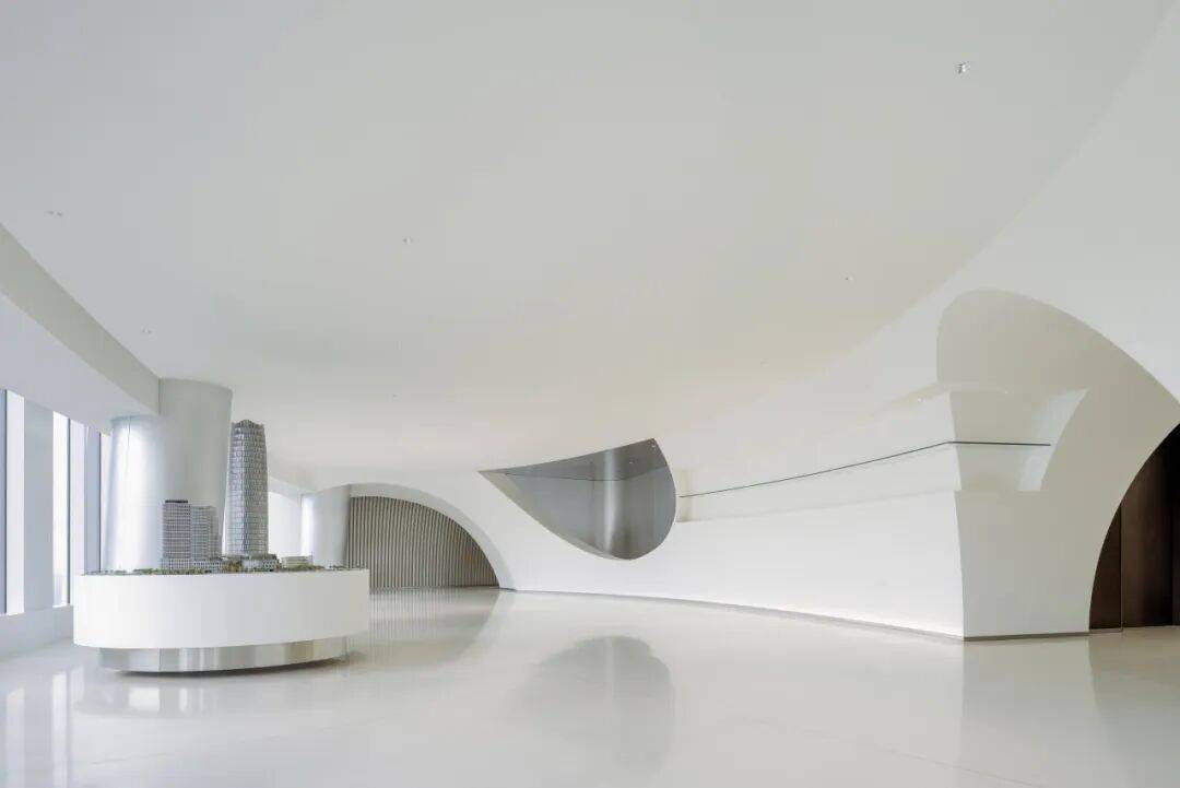 2. 形式即功能:在56层以连续白色拱形空间整合小展厅、会议室、休息厅等功能,强化“冰山山洞”的形式感,使空间与功能高度统一。