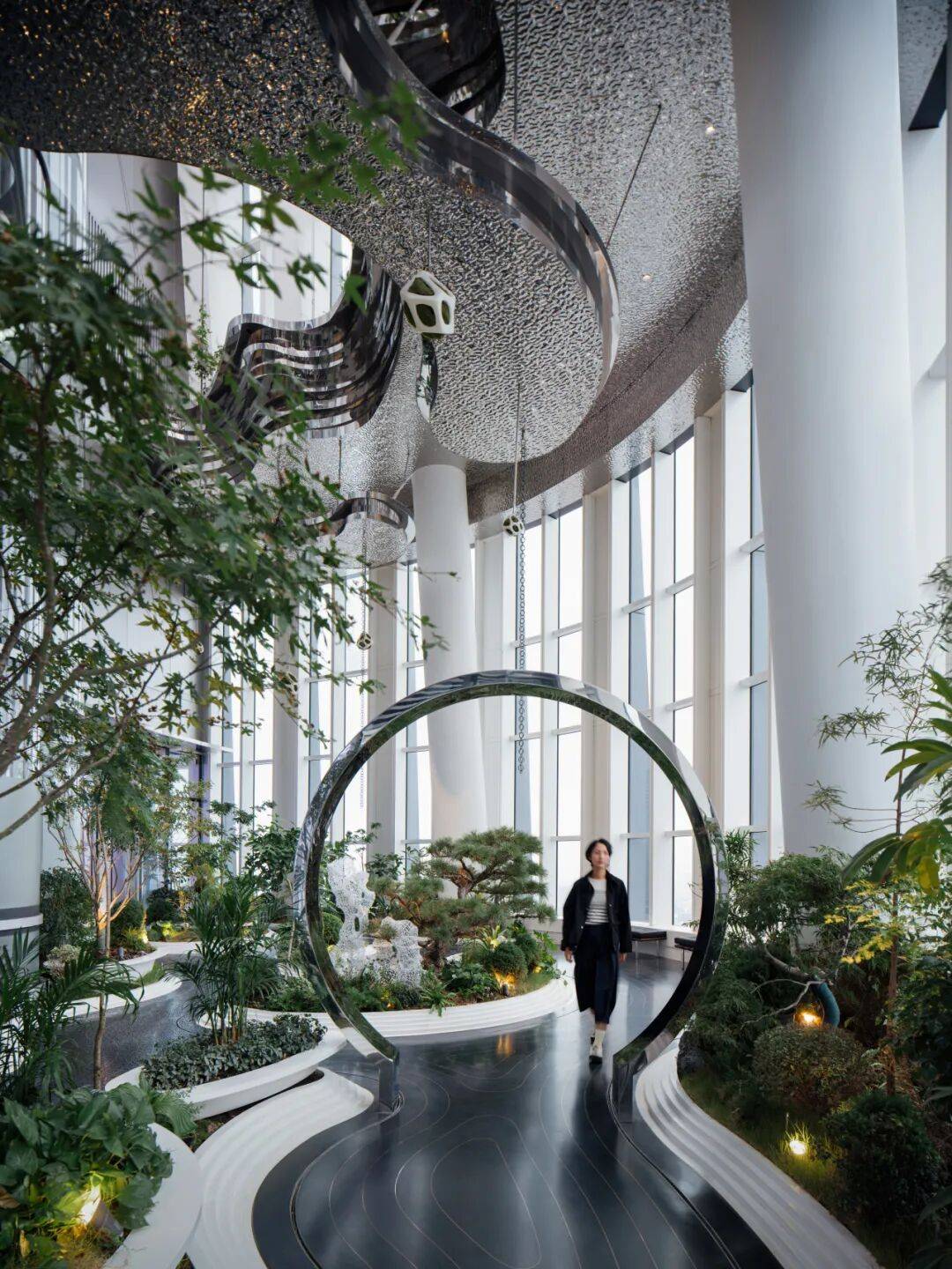 - 55层“固碳花园”:120平米的立体空中花园,以黑色水磨石模拟水面,不锈钢月门和3D打印太湖石点缀其间。浮岛花园在不同高度错落布置,投影于地面形成超过100%绿地覆盖率的视觉效果。