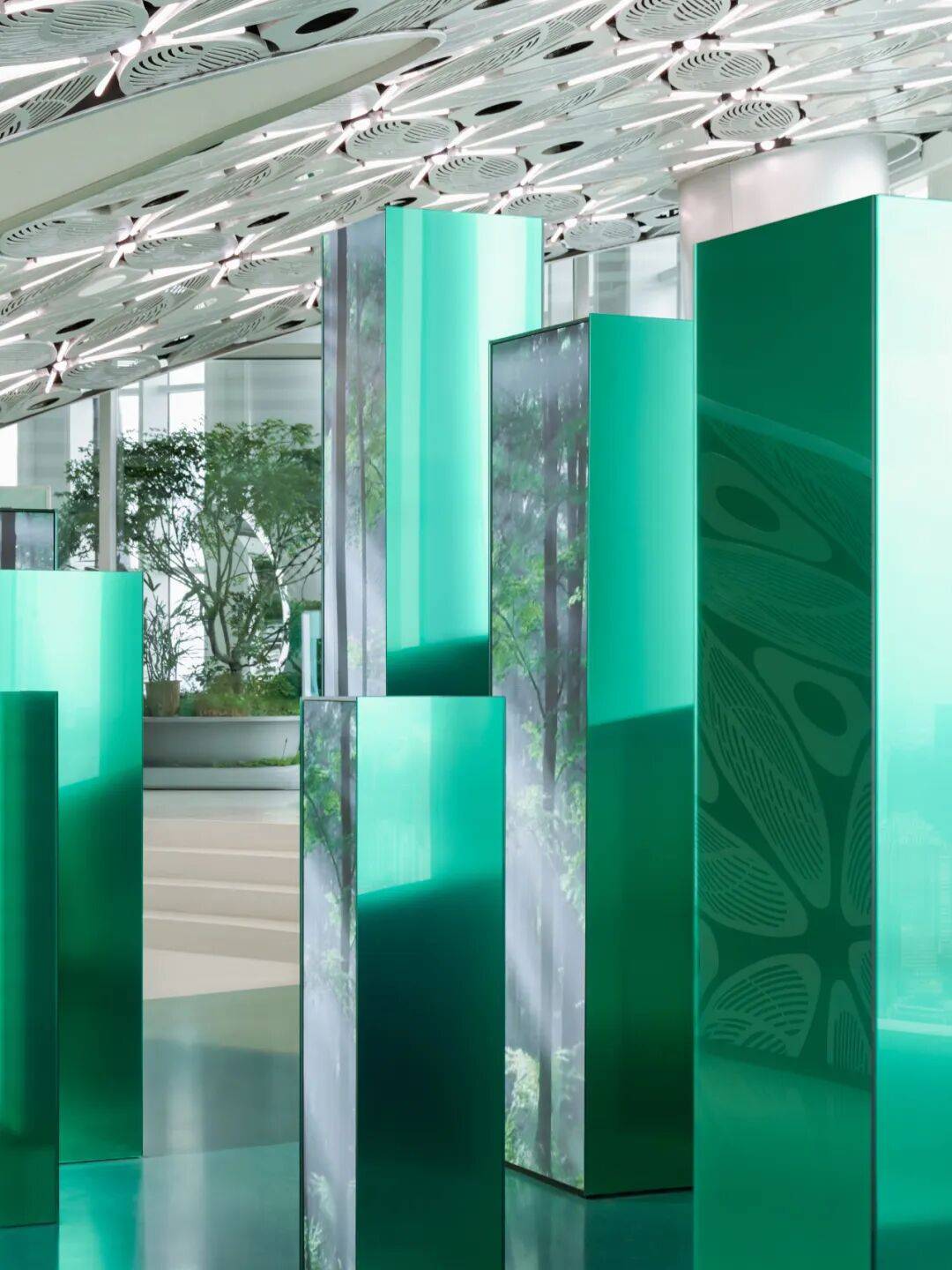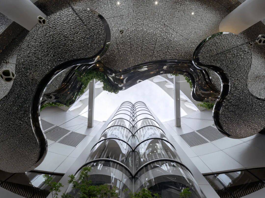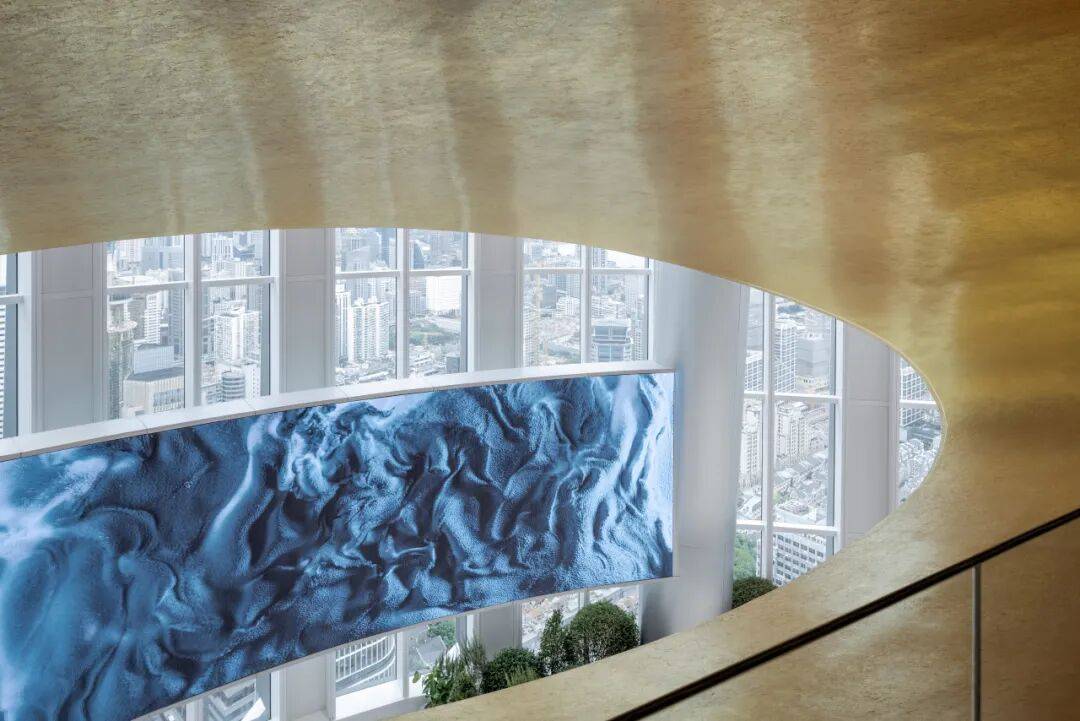 4. 对偶即动态:在冰山主题下引入“绿心”概念。55层120平米的户外空间被设计为悬浮空中花园,通过解构豫园传统园林元素并立体重组,形成波纹不锈钢浮岛、3D打印太湖石等景观,与冰山形成“历史与当代”的对偶,增添动态生机。