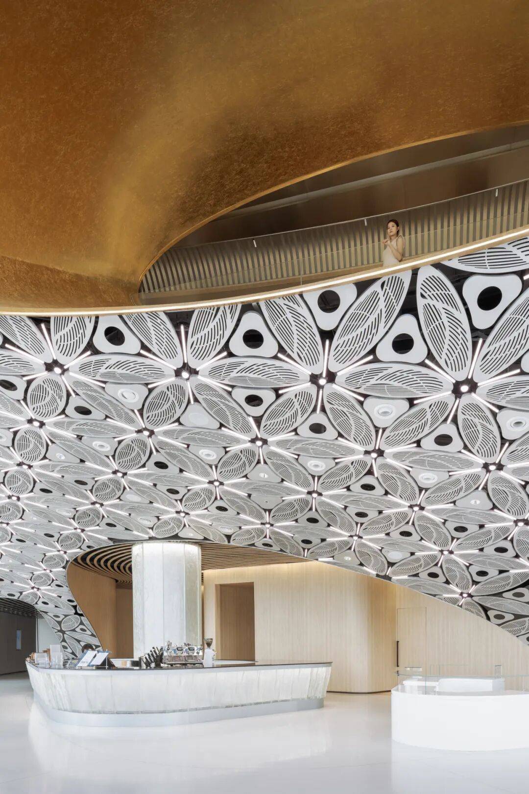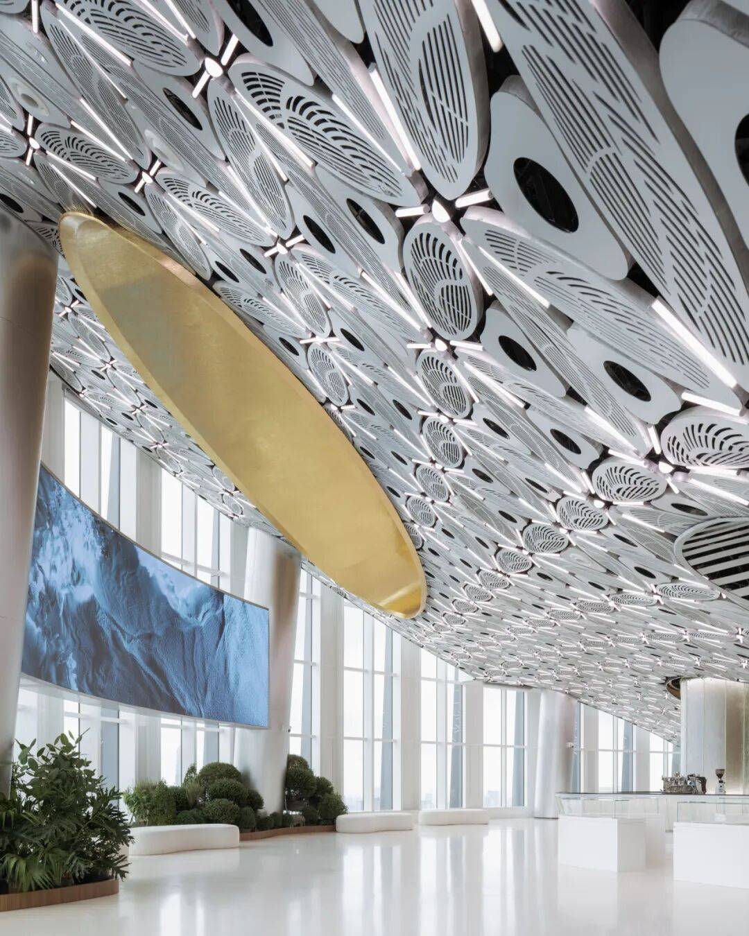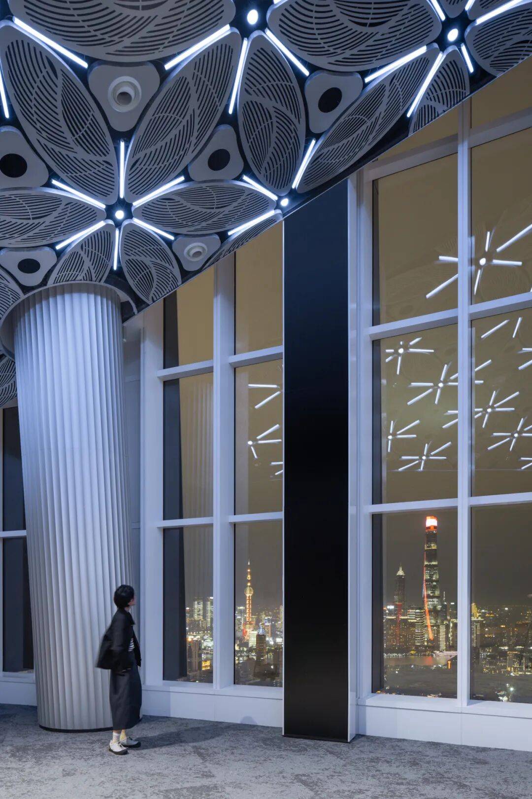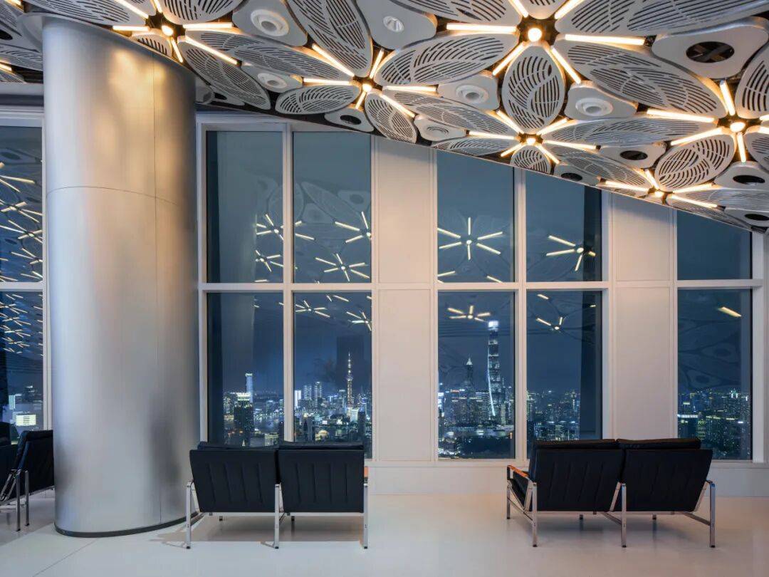 3. 装饰即观点:针对55层复杂设备管线问题,创新性地采用1100块六瓣雪花造型穿孔纹阳极氧化铝板,将设备整合为连续的巨大天花板花纹。这一装饰不仅是美学表达,更传递了上海Art Deco历史中“传统纹样融入未来”的审美态度,被称为“上海Deco”的首次实践。