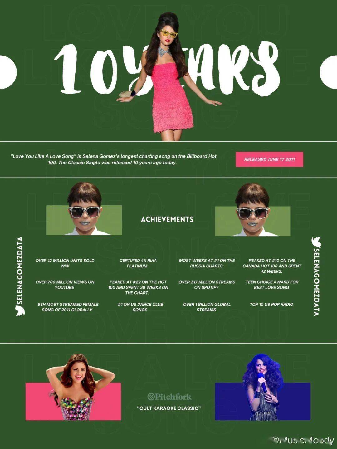 - 《Love You Like A Love Song》:登顶美国Dance Club Songs排行榜,在Billboard Hot 100排名第22位,获美国唱片协会四倍白金认证。