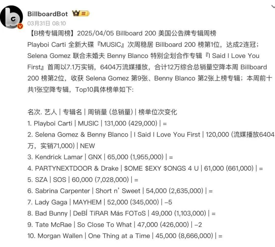 2025年2月,赛琳娜与未婚夫本尼·布兰科合作发行新专辑《I Said I Love You First》,发行首周销量达12万,登顶公告牌二百强专辑榜亚军。