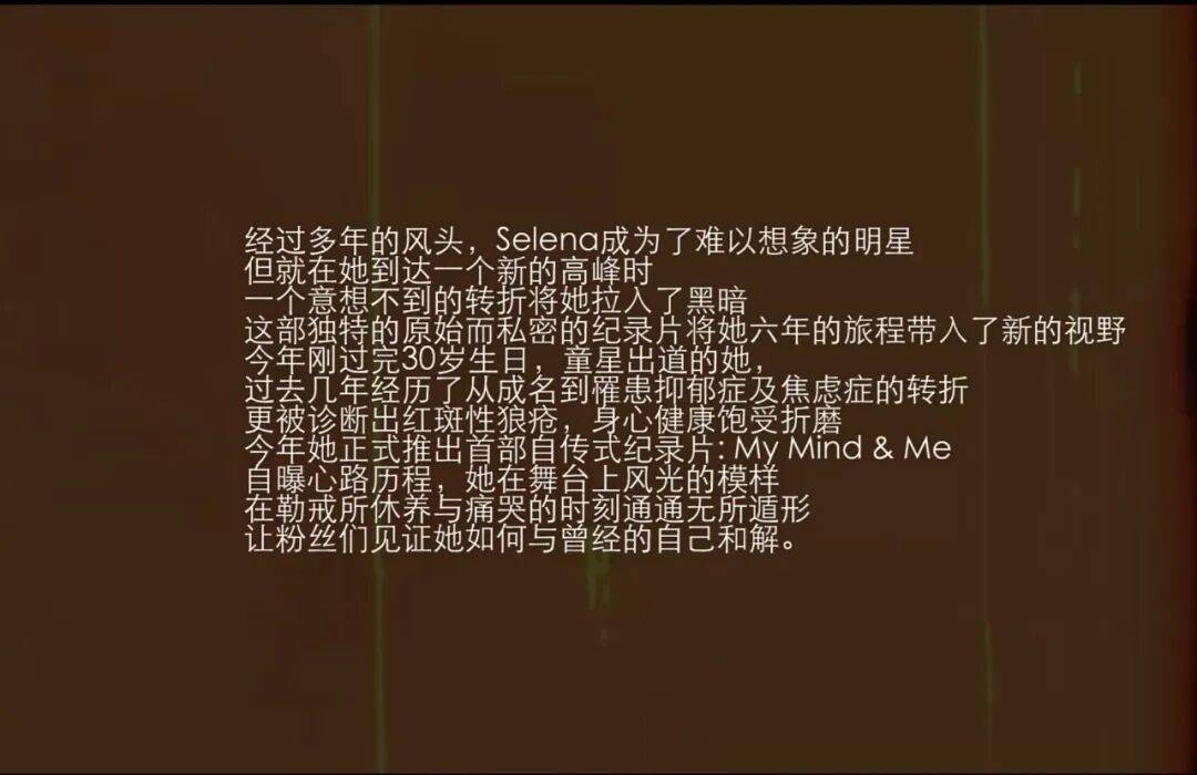 - 2015年:23岁的赛琳娜确诊红斑狼疮。她需要随身携带血压计以防高血压引发中风,并伴随严重心理问题。即使彩排表现良好,仍会自我否定,担心唱片主席失望,甚至产生轻生念头。