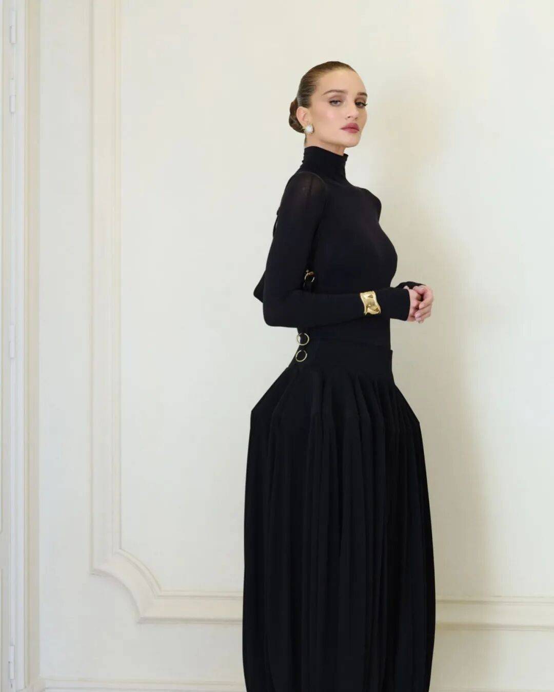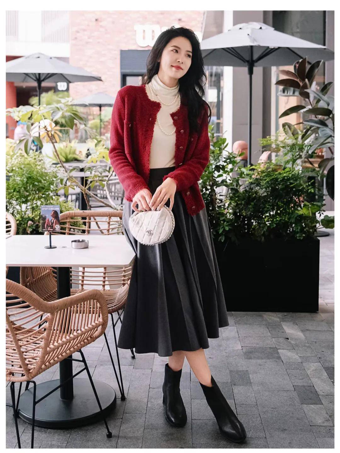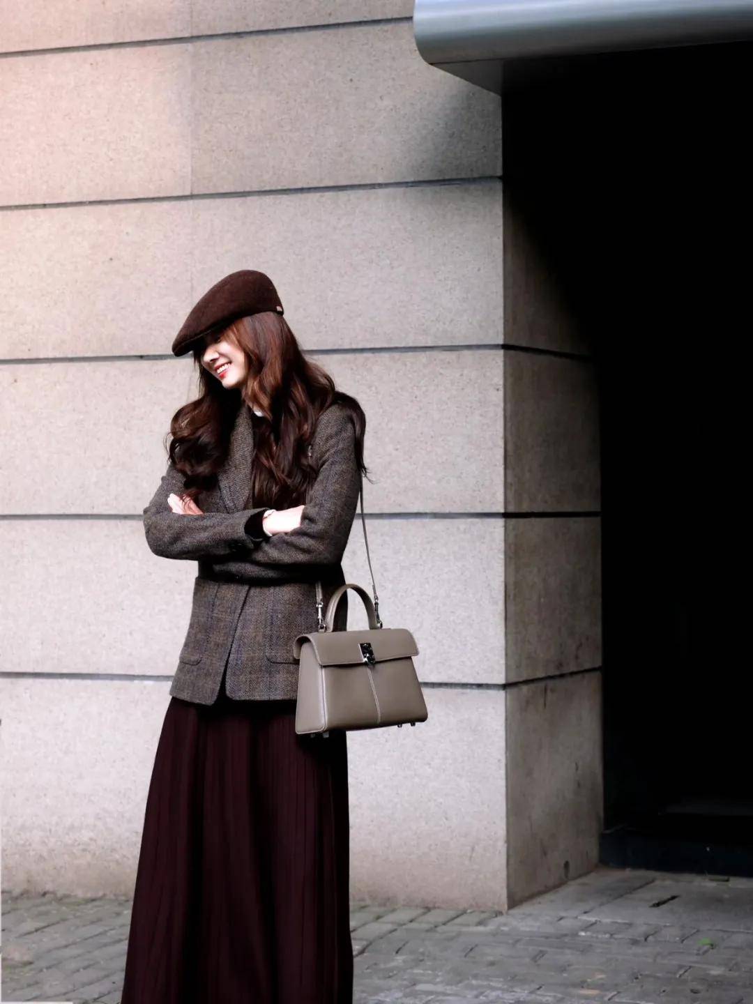 意式美学套装:焦糖棕羊绒西装(剪裁考究)+ 同色系百褶裙 + 哑光乐福鞋