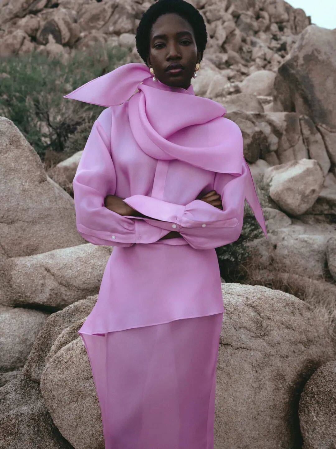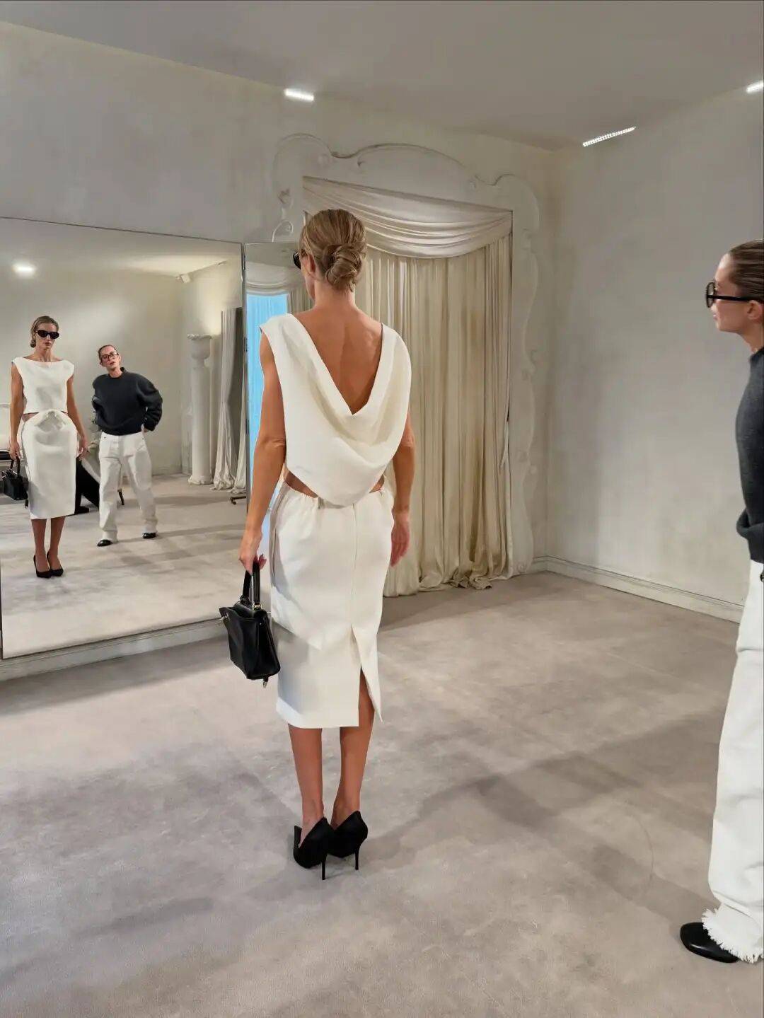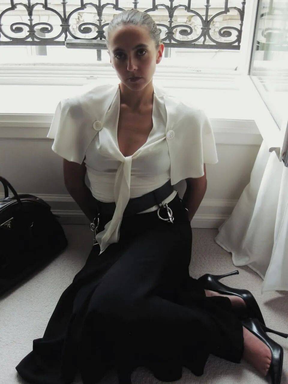 要点:内搭荡领真丝背心,袖口挽起露出手工缝线。
