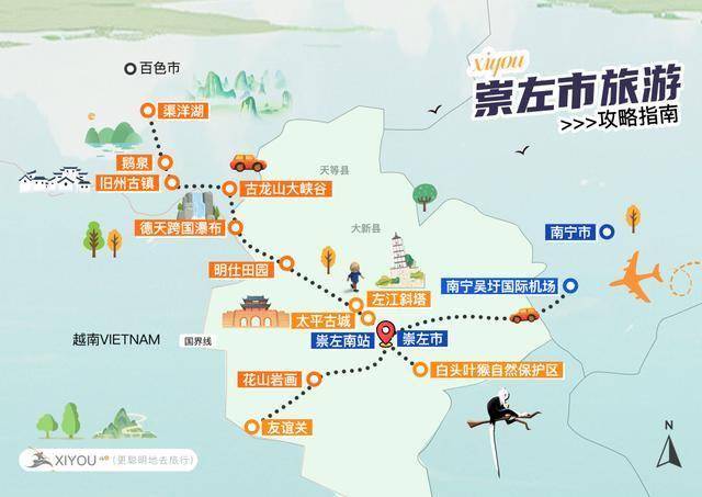 - 外部交通:南宁吴圩机场有航班直达;高铁可至南宁东站,转乘动车至崇左南站。