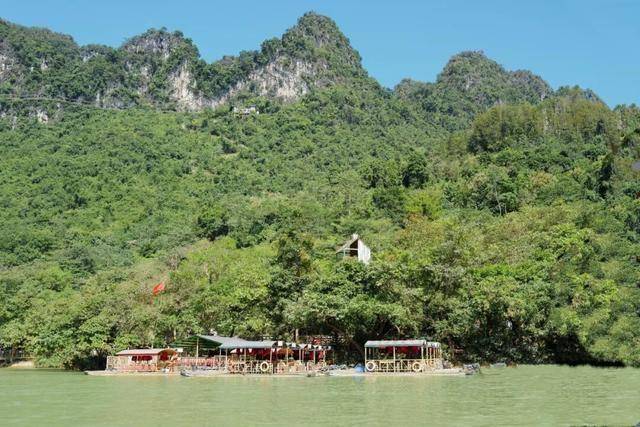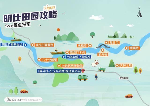 竹排路线:竹排码头→九曲桥码头→壮族民居博物园