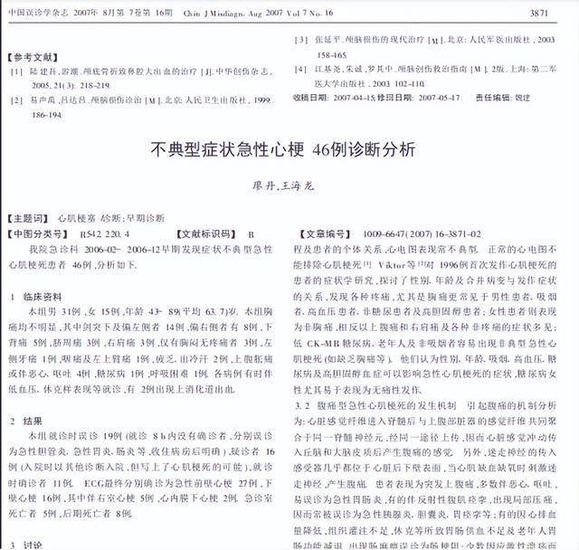 [1]廖丹,王海龙.不典型症状急性心梗46例诊断分析[J].中国误诊学杂志,2007