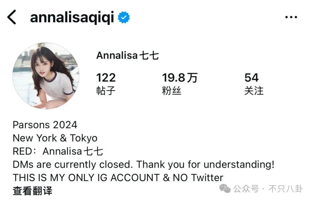 被曝对象七七(Annalisa),出生于2001-2002年,美籍华裔,祖籍广东深圳。其身份远非普通网红,而是兼具高学历、财富与设计才华的复合型人物: