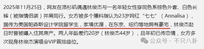此次偶遇迅速登上微博、小红书、抖音热搜,#林俊杰新恋情# #林俊杰情侣装# #Annalisa家境#等话题阅读量破亿,将这对相差20岁的组合推向风口浪尖。