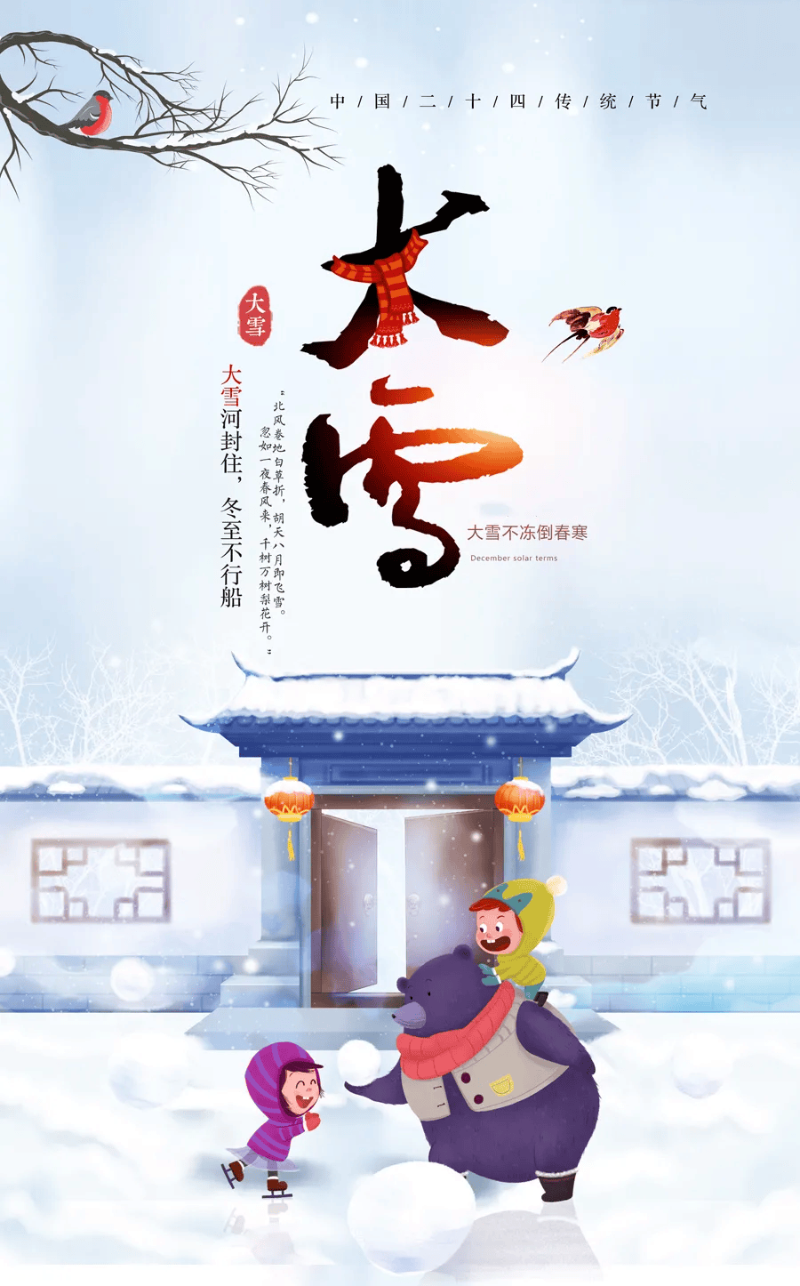雪花飘飘,大雪来到;问候祝福,前来报到;注意添衣,保暖重要;坚持锻炼,预防感冒;祝你幸福,时刻笼罩;健康拥抱,心情美妙!