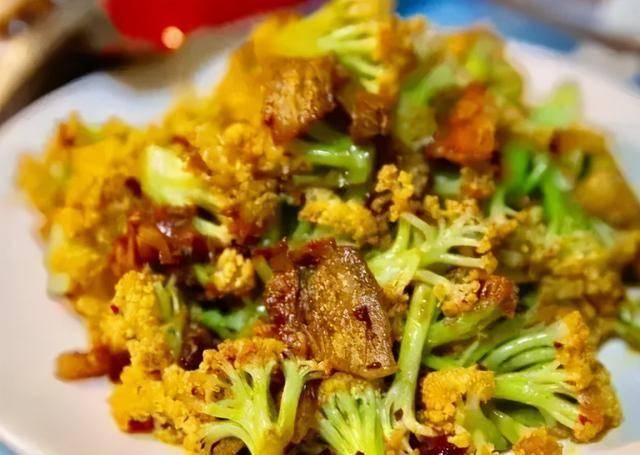 香肠炒花菜:香肠切薄片,减少用量,搭配大量花菜,增加饱腹感。