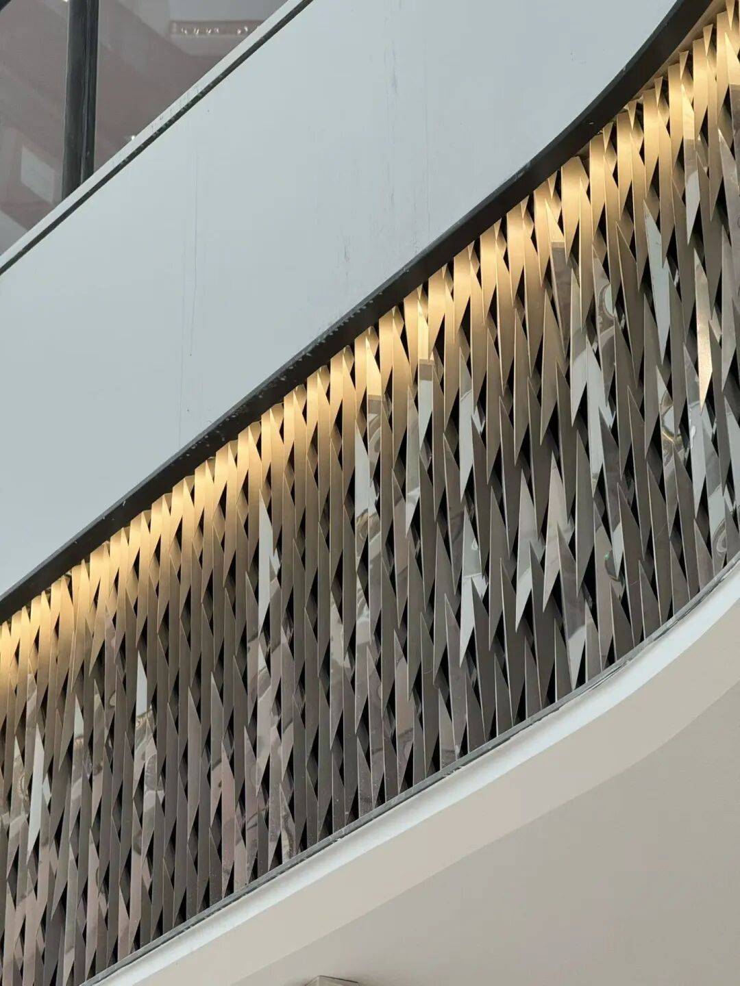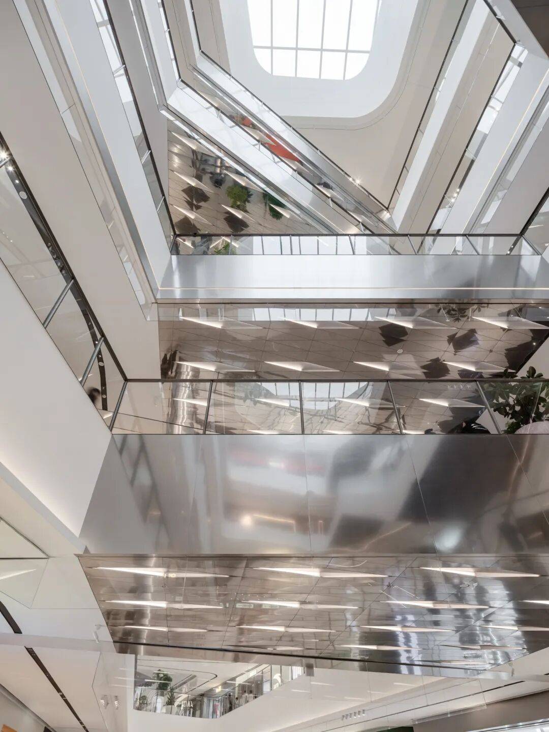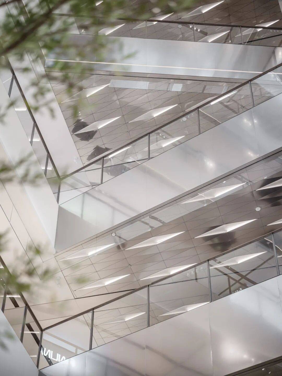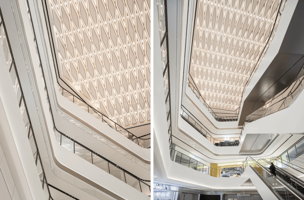 中庭檐口取材河面波光粼粼、熠熠生辉的韵律,构建出一个将人往上引流到两端重要空间的旅程高潮。