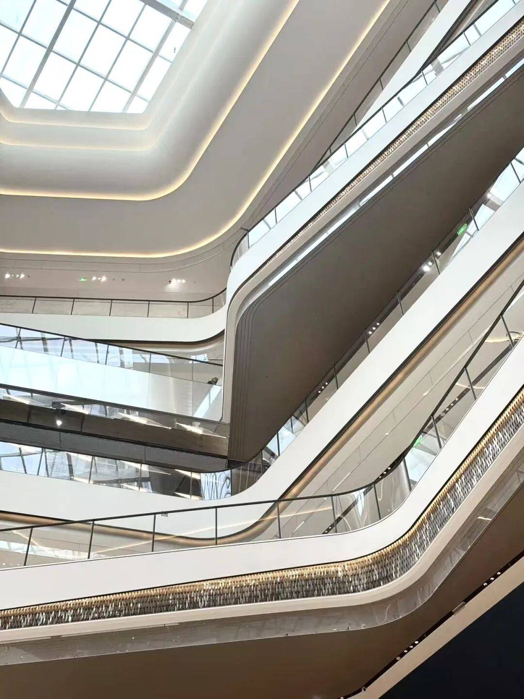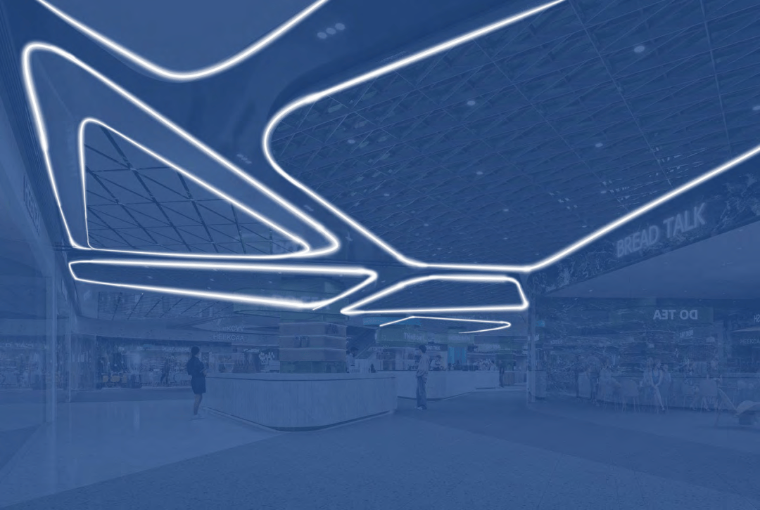 流动的线条语言:中庭穹顶、导视系统、天花造型均采用柔和的曲线与波浪形态,模拟水流的动态美感,营造轻盈通透的空间氛围。