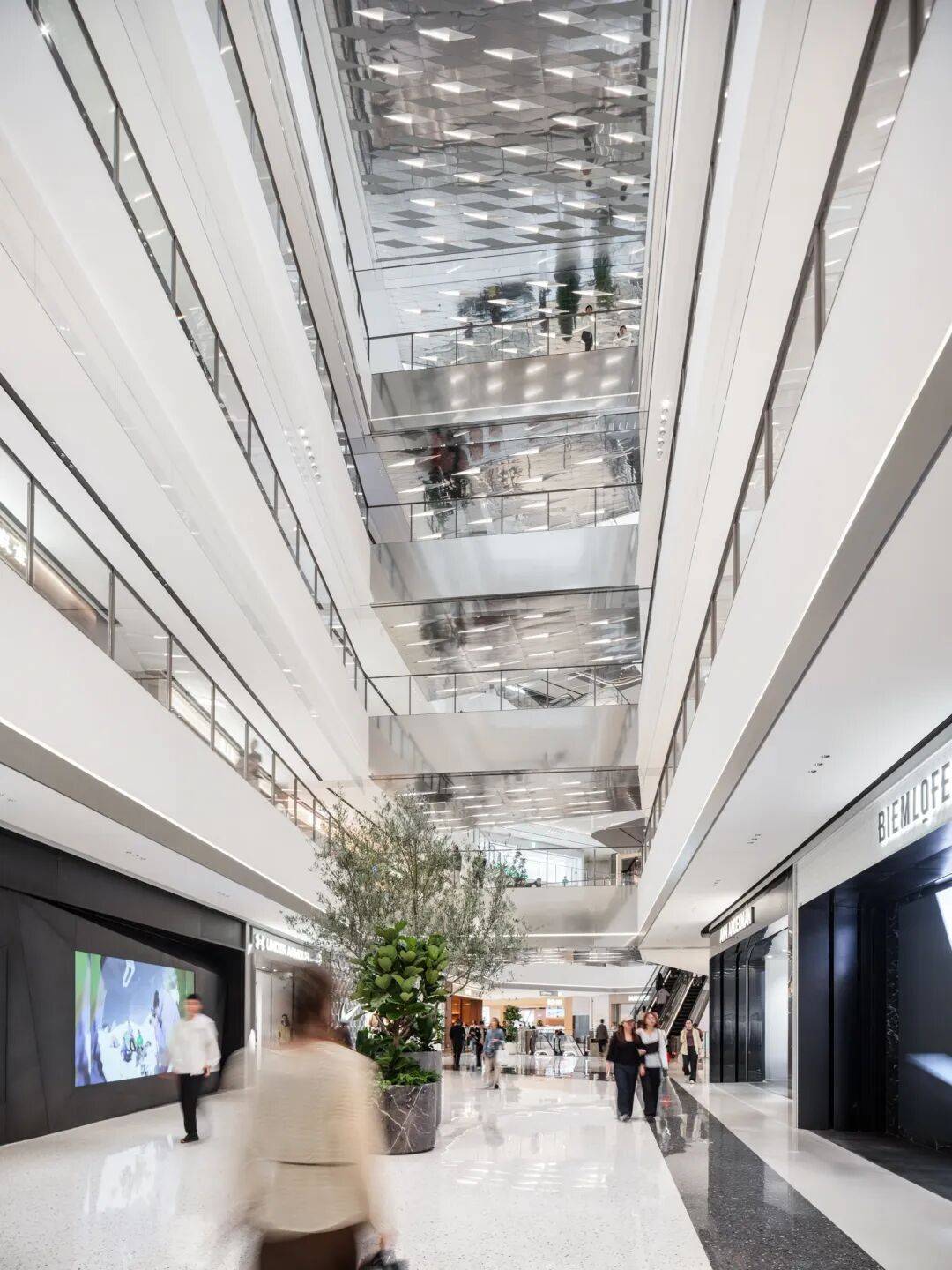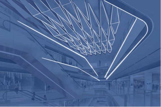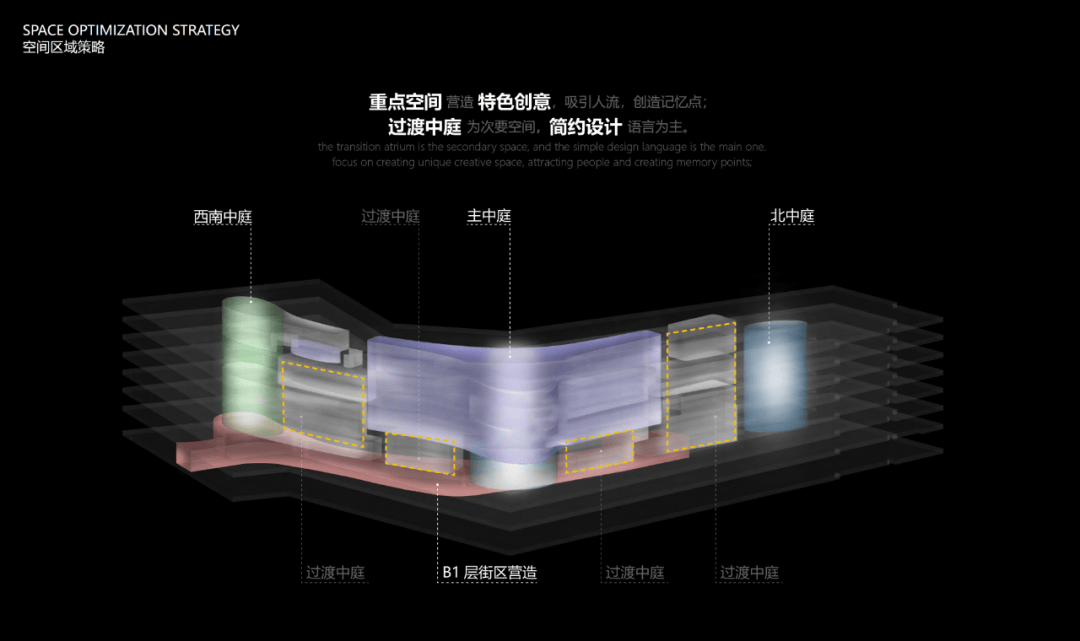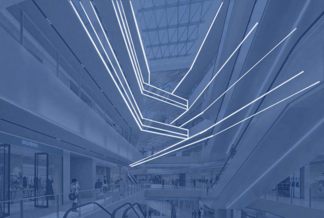 基于对原建筑七个中庭及300余米长的南北动线的设置考量,设计采用分段式策略,合理把控空间节奏,在重点空间塑造视觉亮点引导人流自然流动与汇聚,塑造律动而多样的商业探索体验。