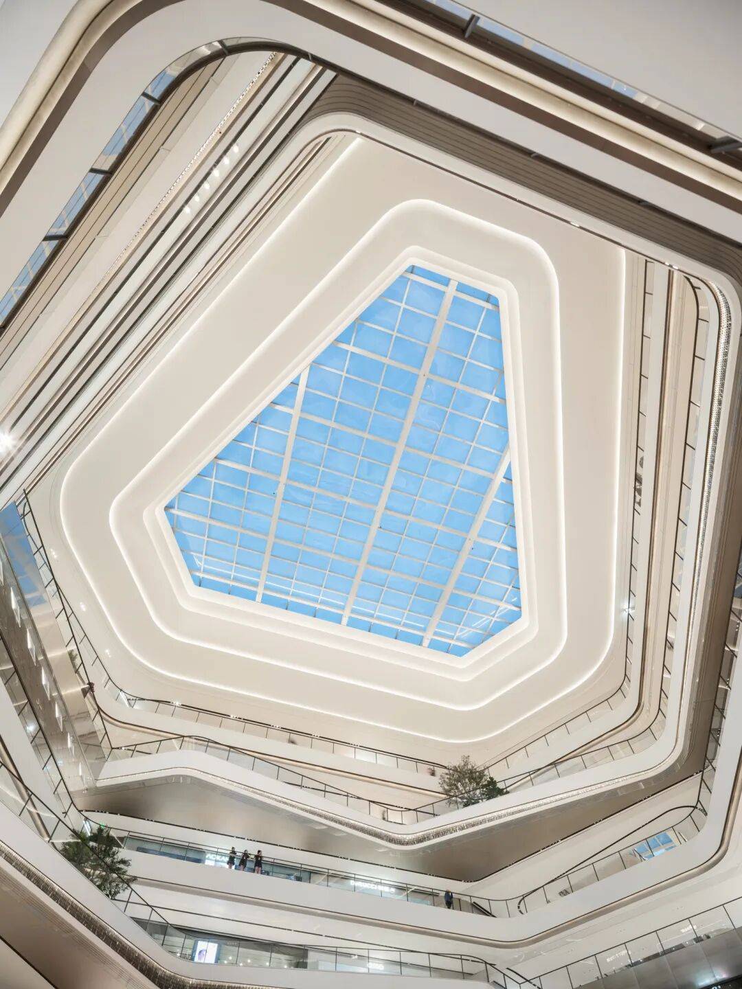 设计以大中庭为主,两个小中庭为辅的策略,通过空间层数的叠加与造型穿插形成视觉对线。通透天窗设计最大化利用自然光,以明亮、开阔的空间氛围串联三个中庭,仿若淮河两岸在此交汇,让人流在此得以汇聚。