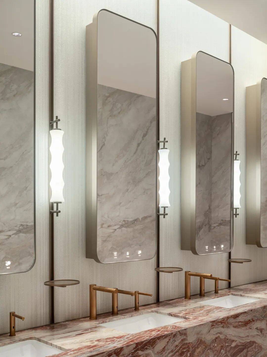 电梯厅:运用透光性与光影和质感变幻塑造空间灵动感,艺术玻璃表面抽象化波浪纹与剪影,结合灯光,渐变呼应,模拟运河水面波光粼粼的视觉效果,营造出沉浸式水岸足迹。