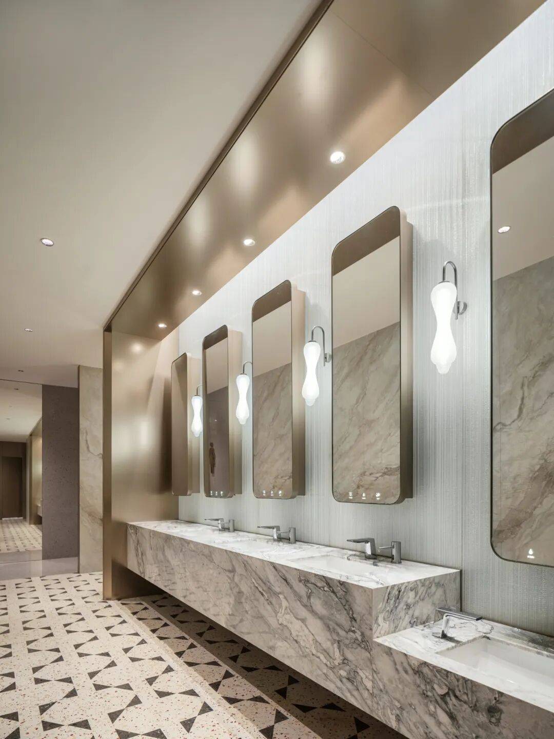 地面系统:公共区域采用暖灰色系天然石材与仿水磨石地坪拼接,既耐磨又具艺术感;主力店门口则使用铜条镶嵌边界,强化品牌识别。