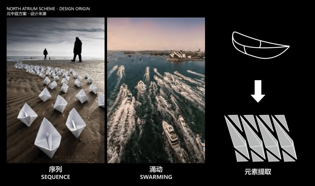 位于北中庭中的局部闷顶,设计为突破其压迫感,提取运河行船的几何形态,塑造百舸竞渡的空间主题。