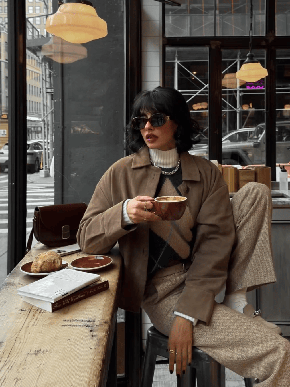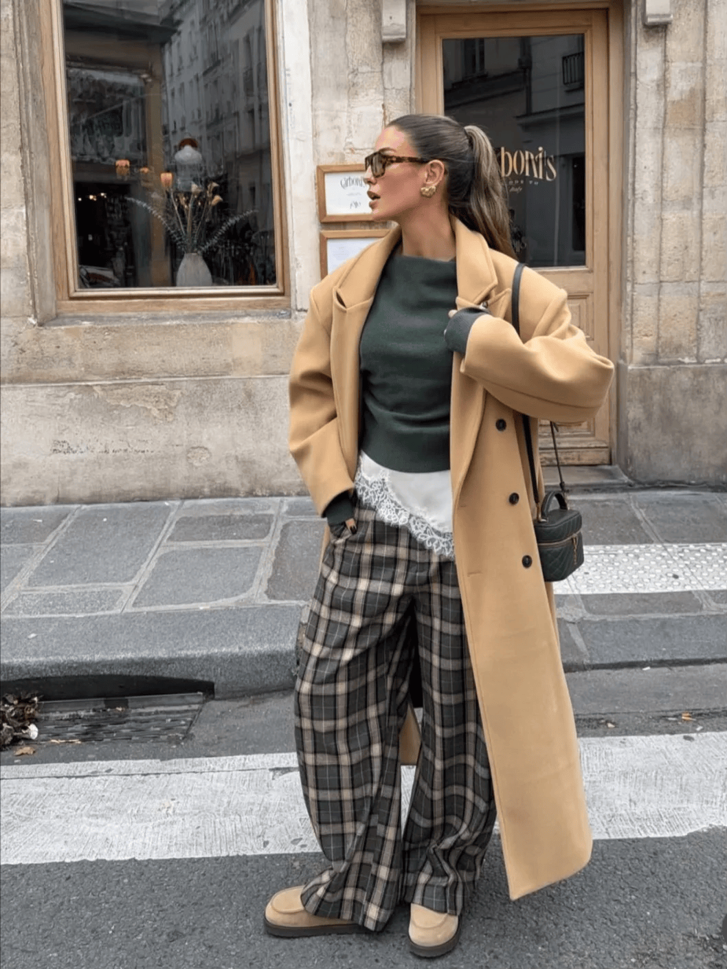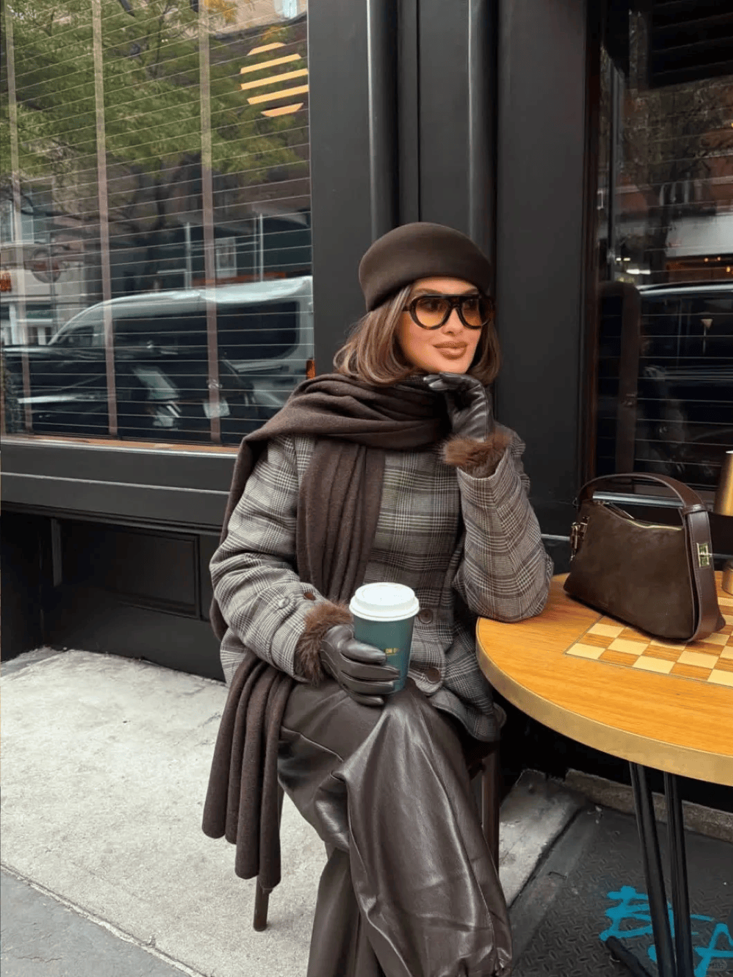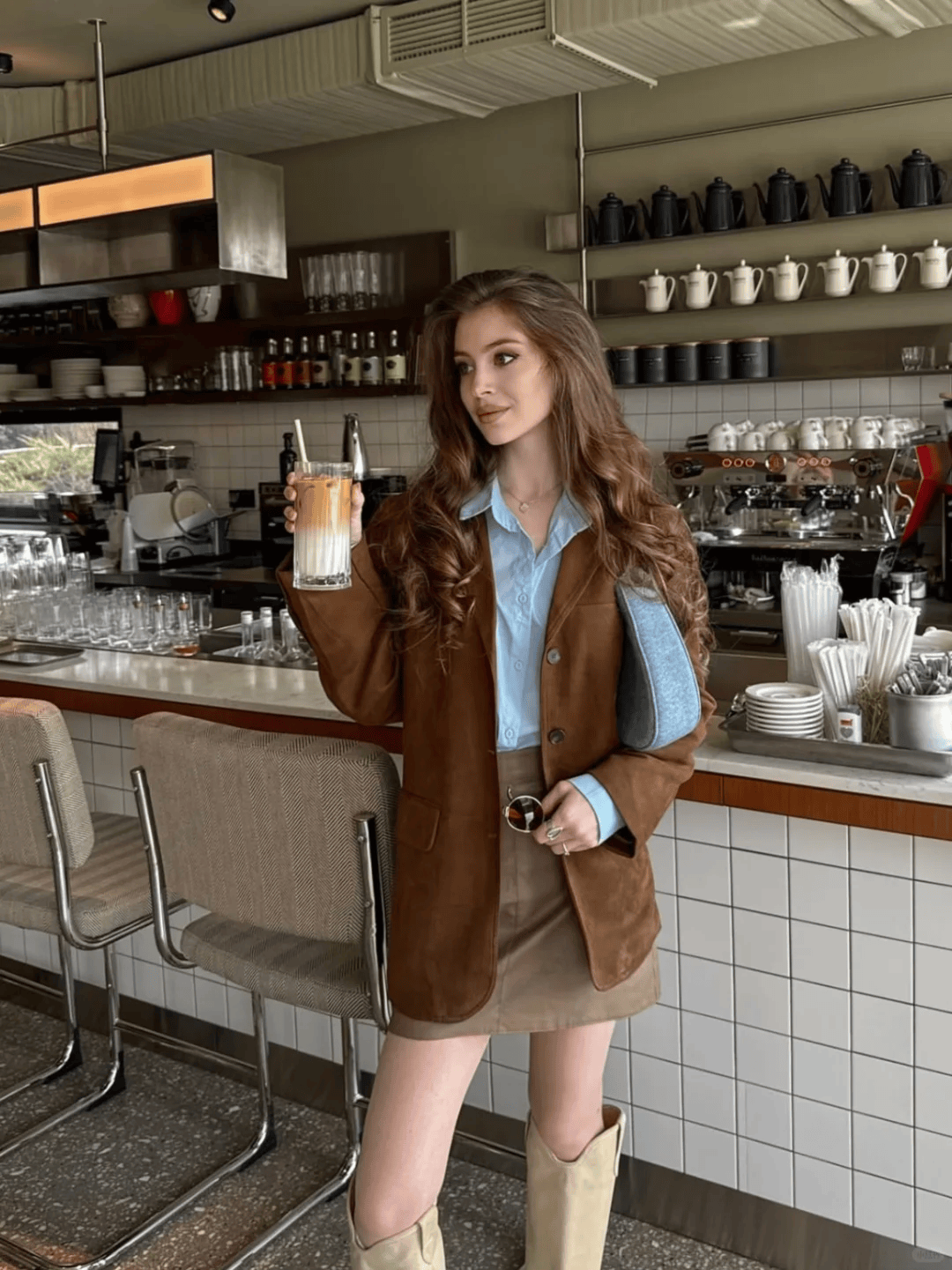 棕色格纹大衣+蓝色紧身牛仔裤+黑色短靴,复古又显瘦。