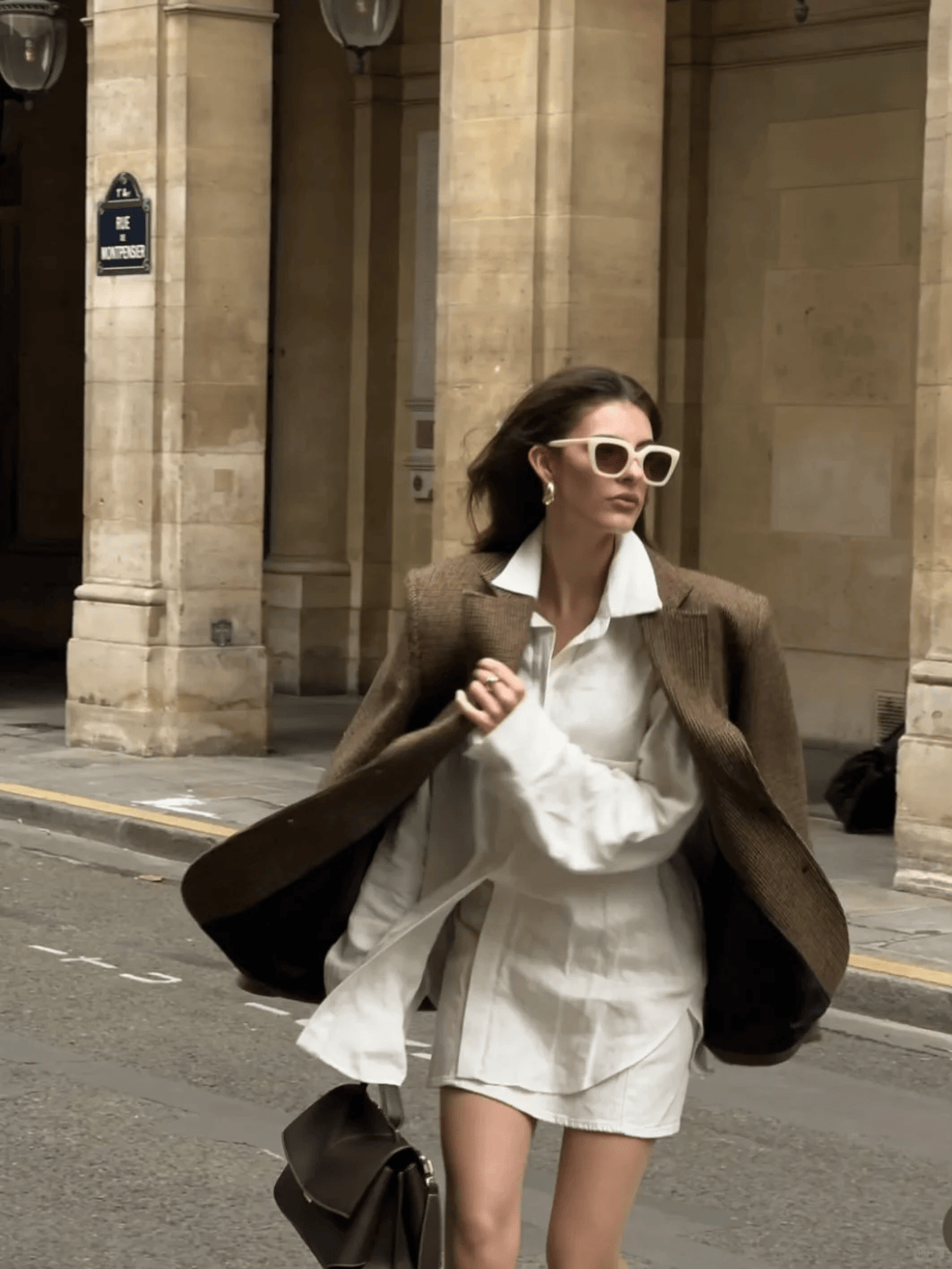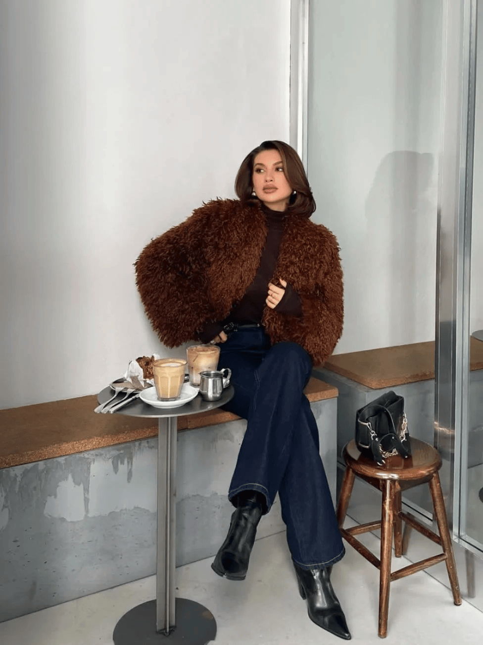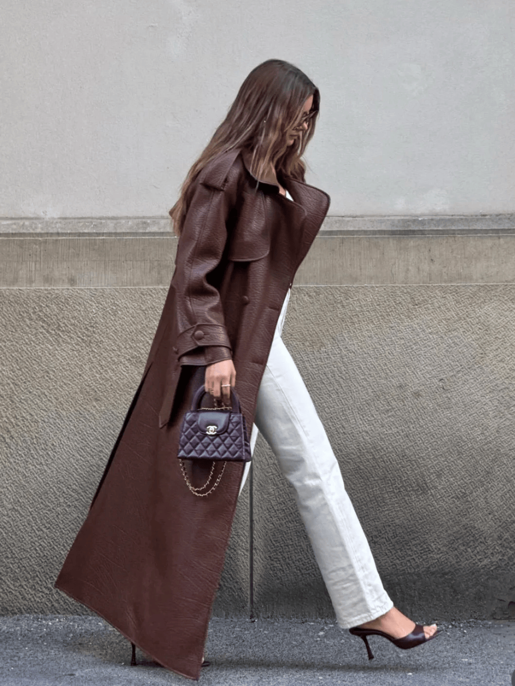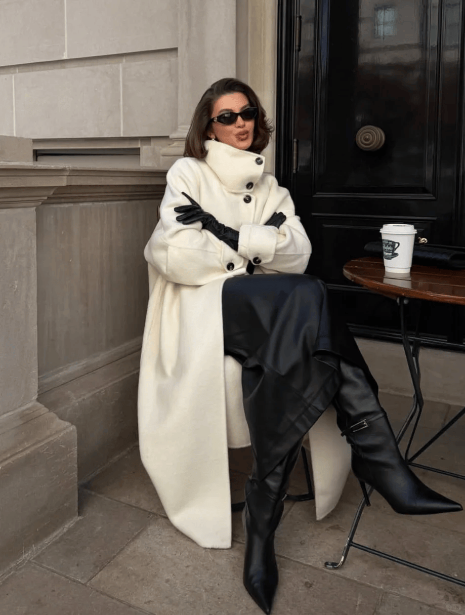 黑色长款大衣+黑色迷你包,配白色阔腿裤,气场十足且显高。