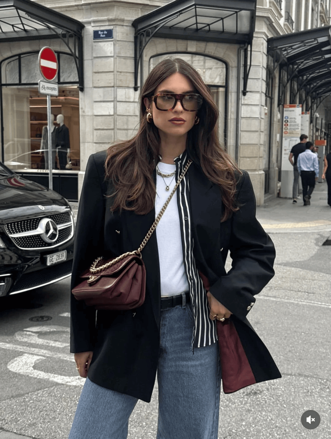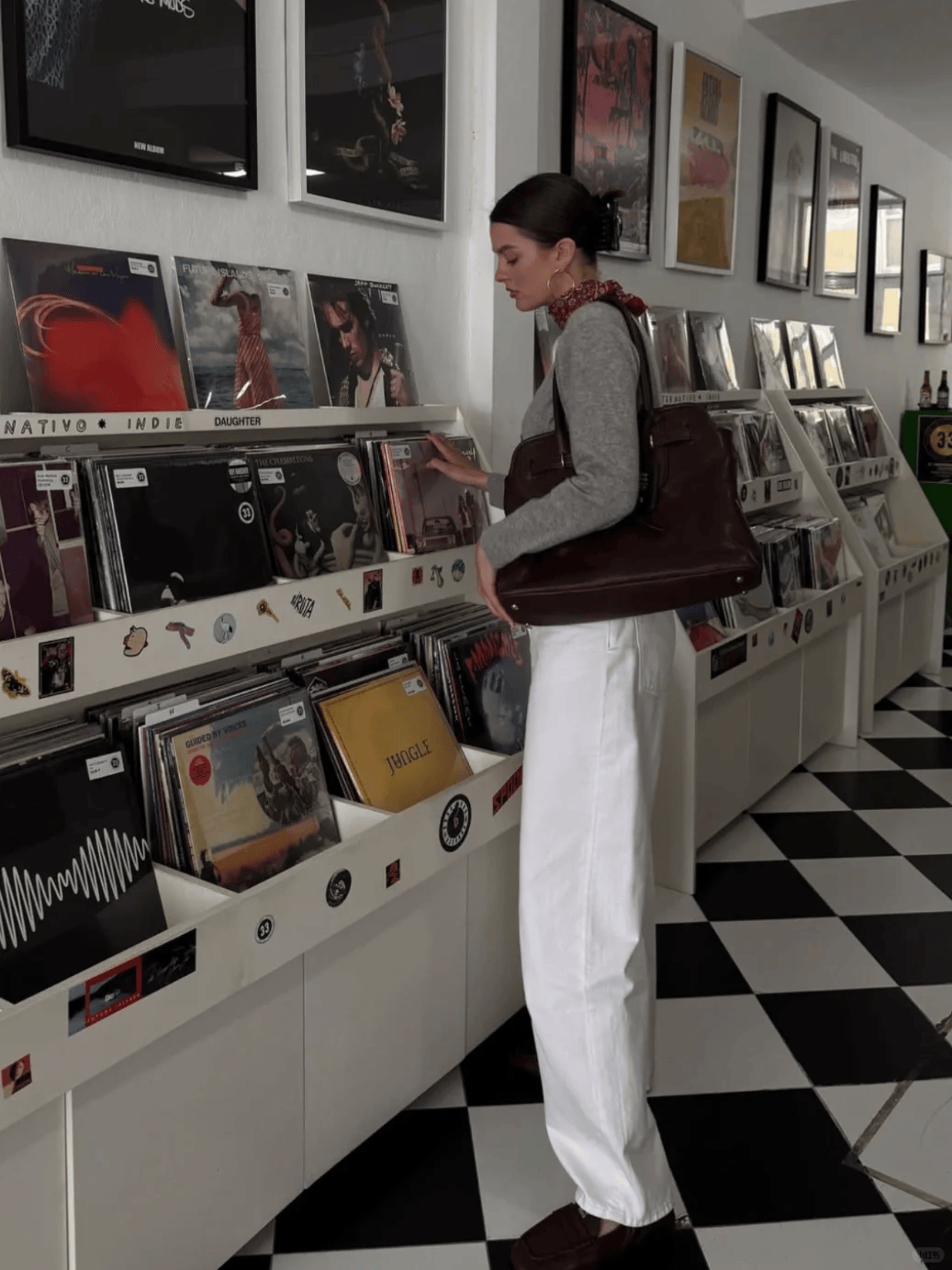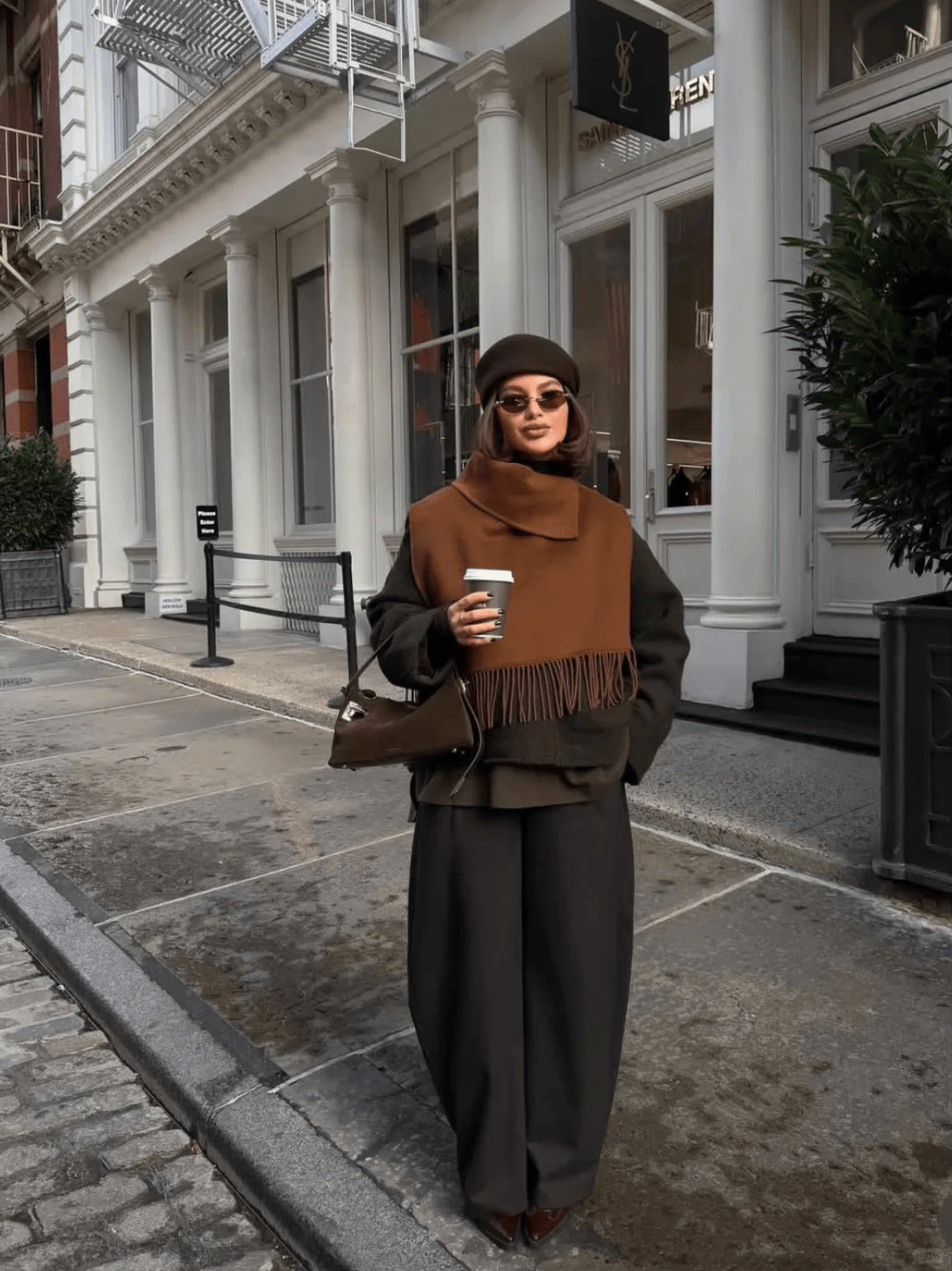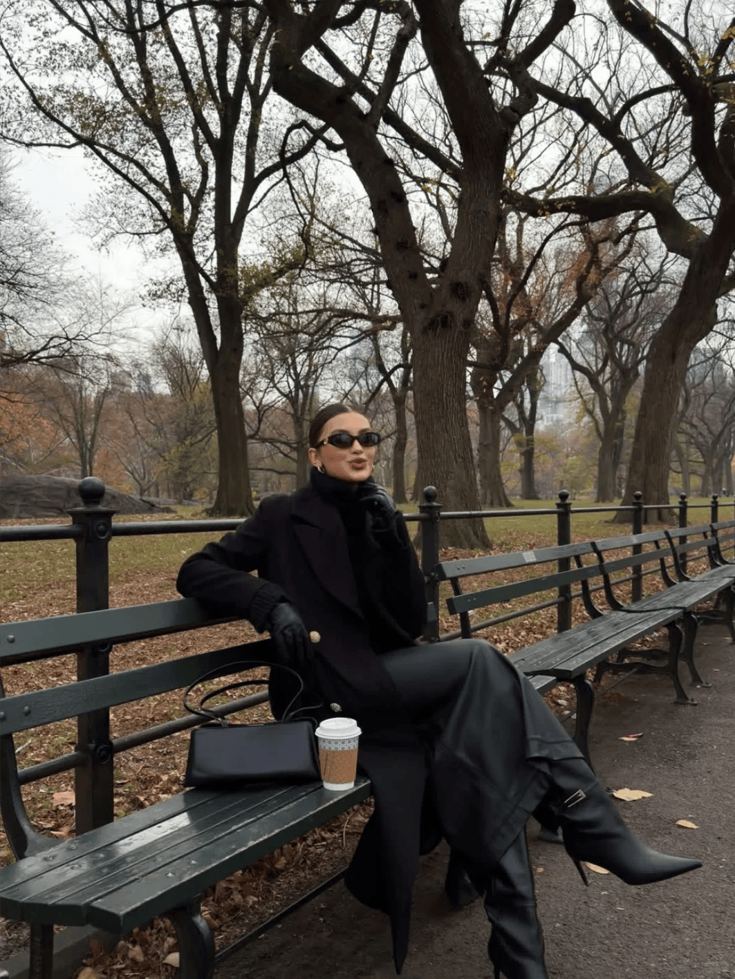 黑色长款大衣+黑色迷你包,配白色阔腿裤,气场十足且显高。