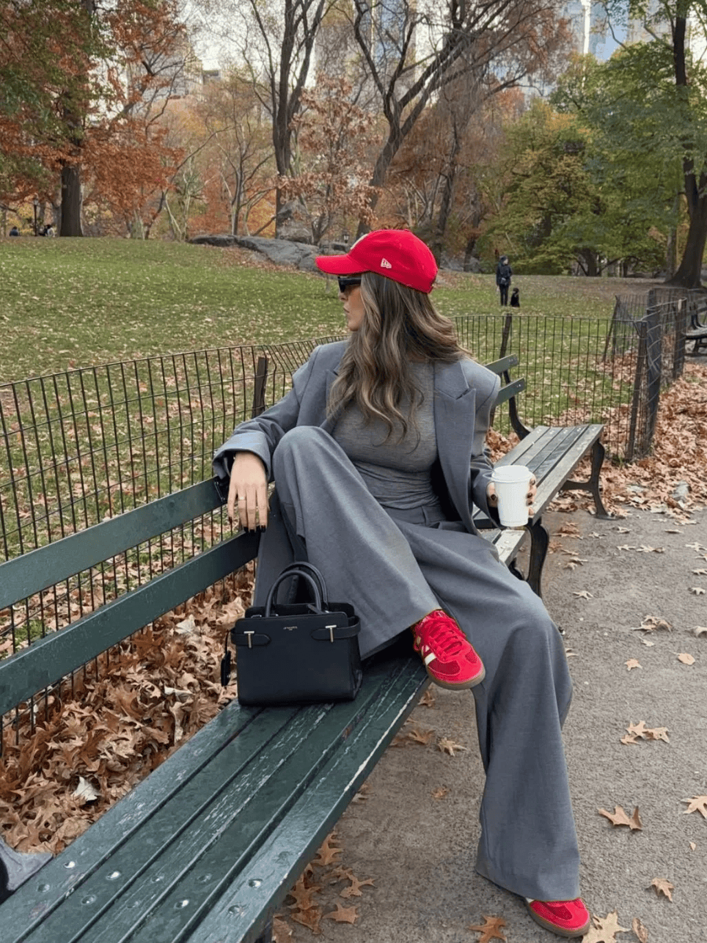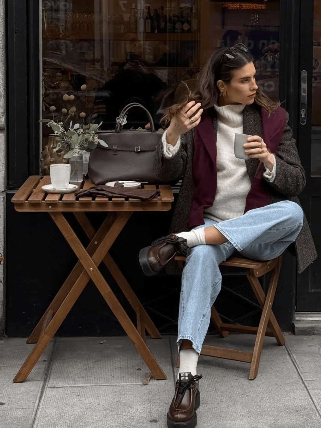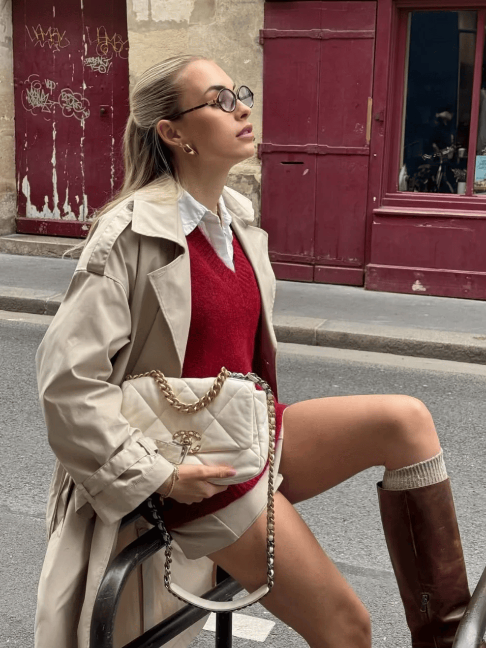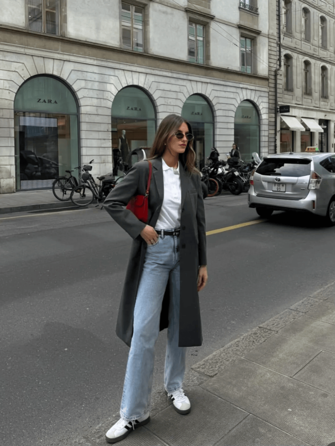 驼色长款风衣+红色迷你包,配牛仔裤和乐福鞋,休闲又精致。
