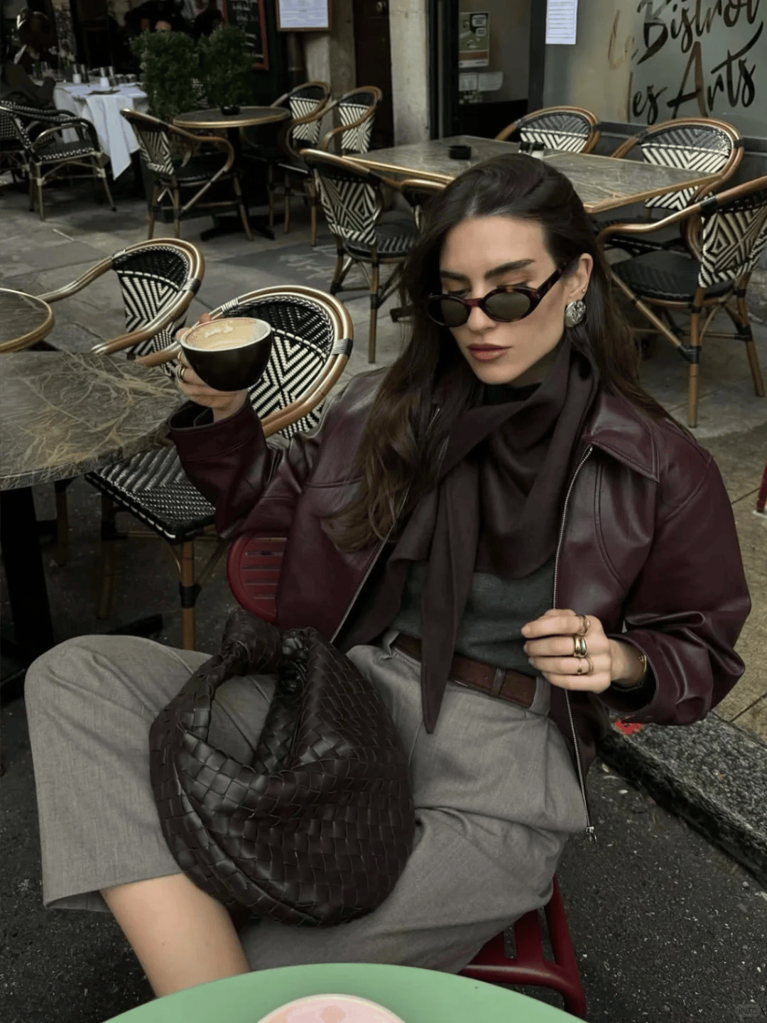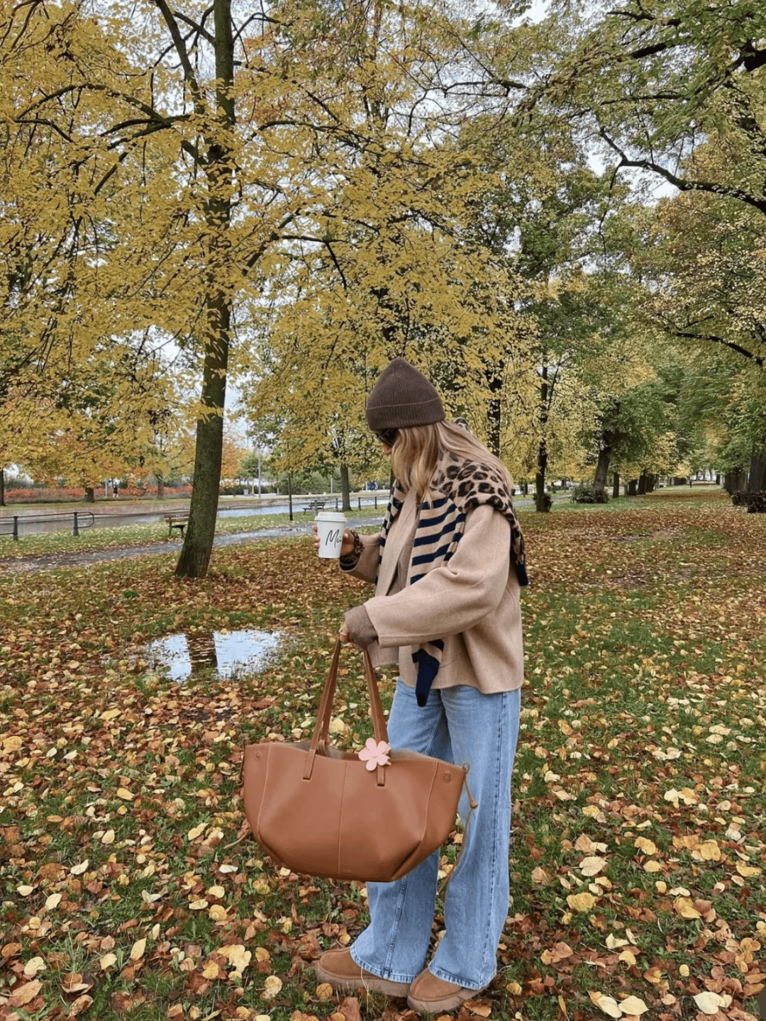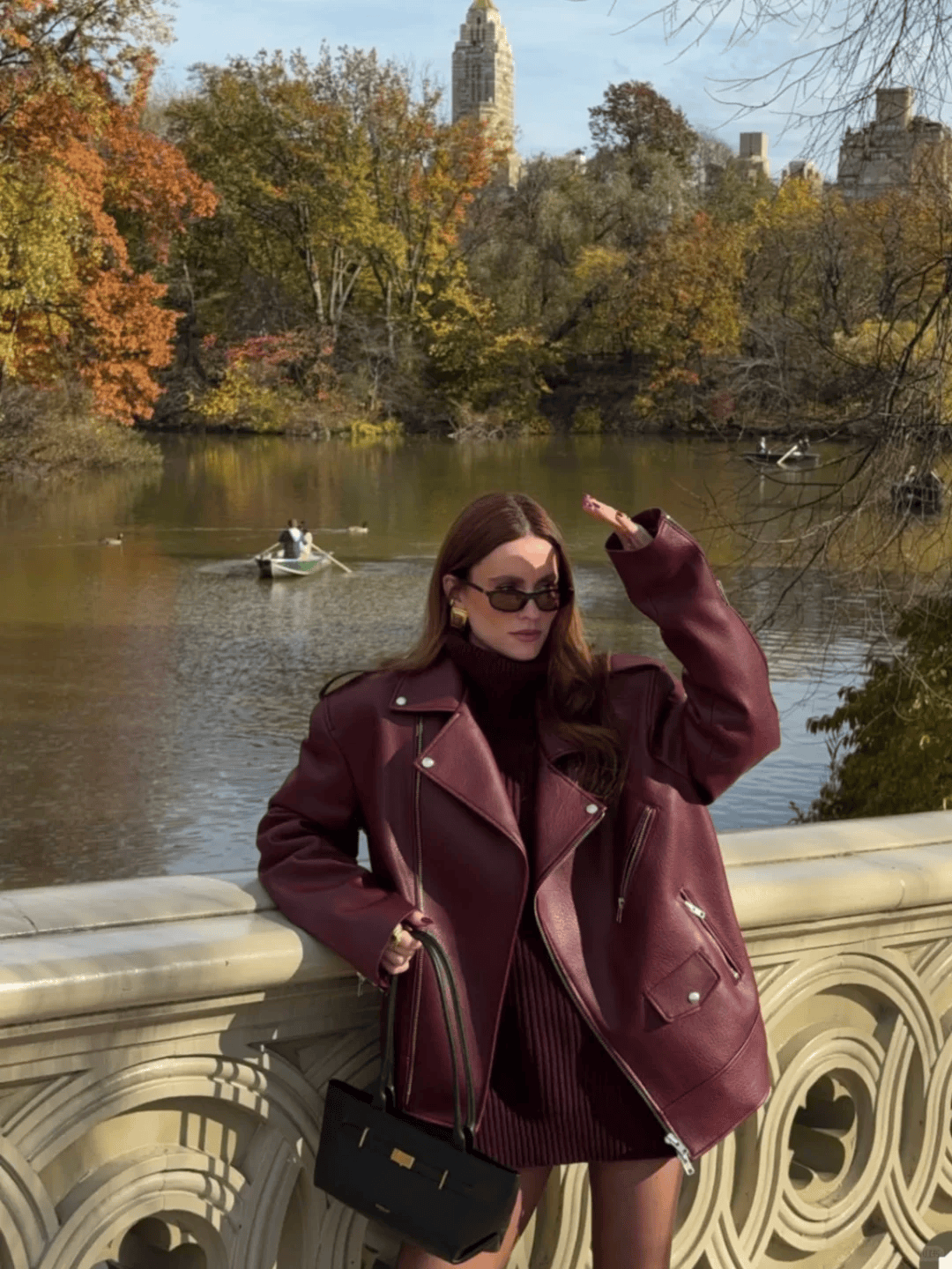 驼色长款风衣+红色迷你包,配牛仔裤和乐福鞋,休闲又精致。