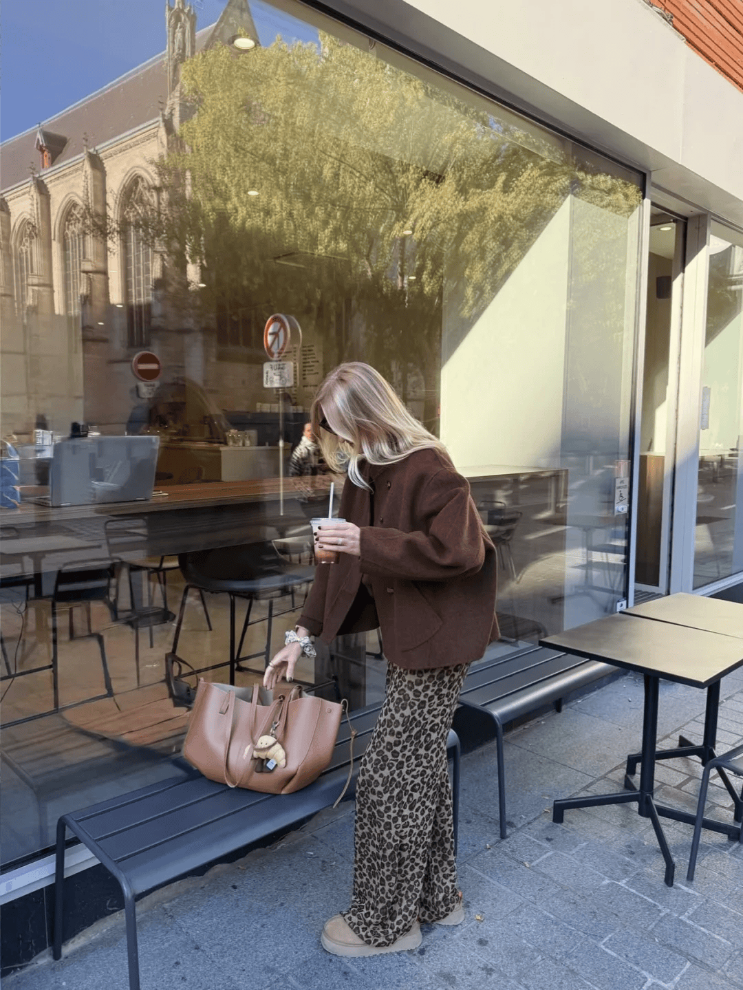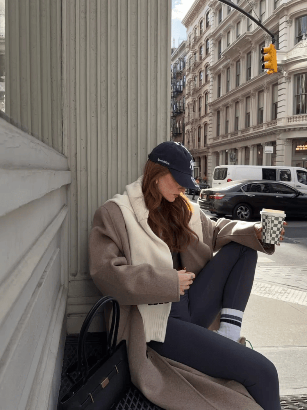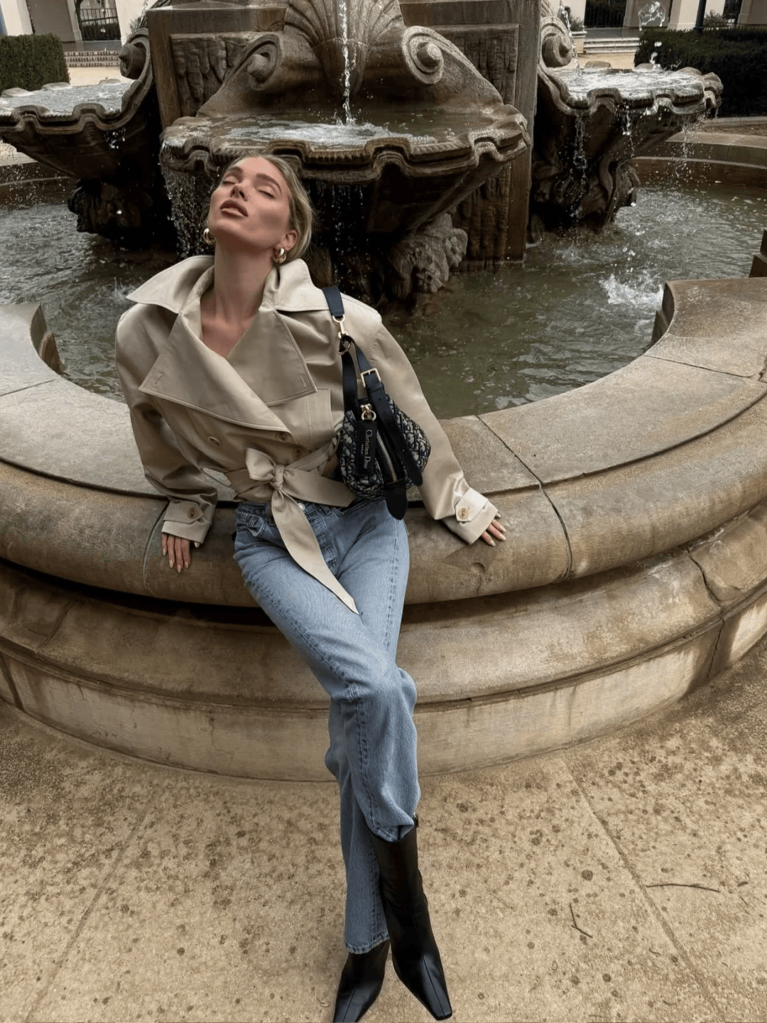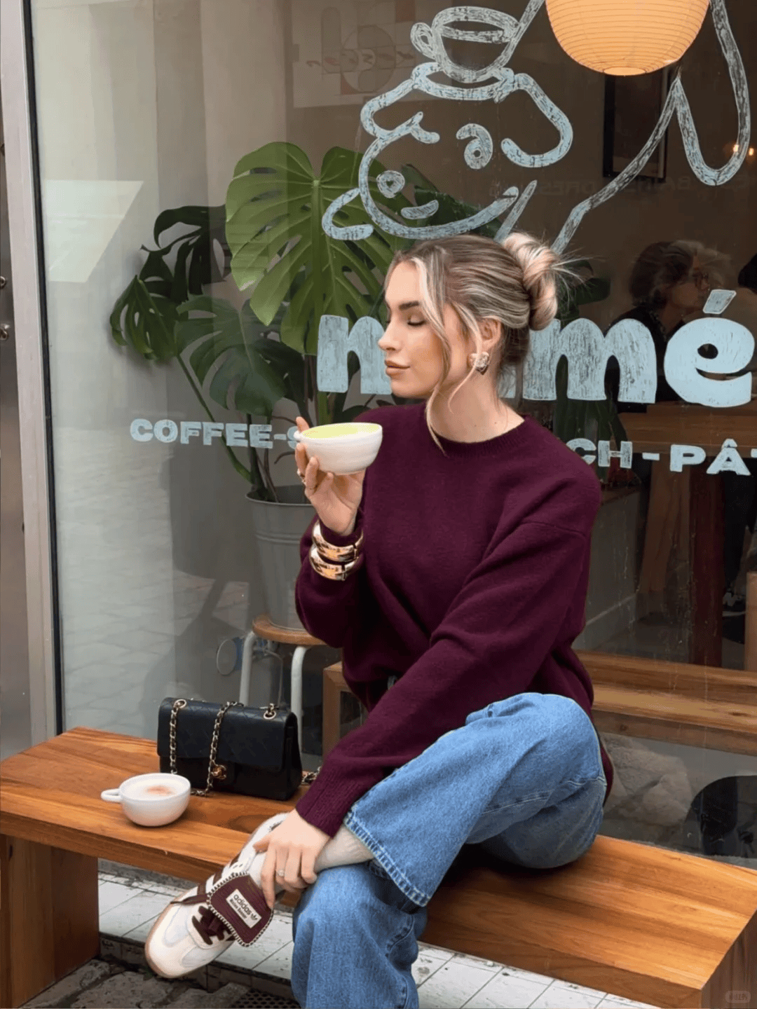 驼色长款风衣+红色迷你包,配牛仔裤和乐福鞋,休闲又精致。