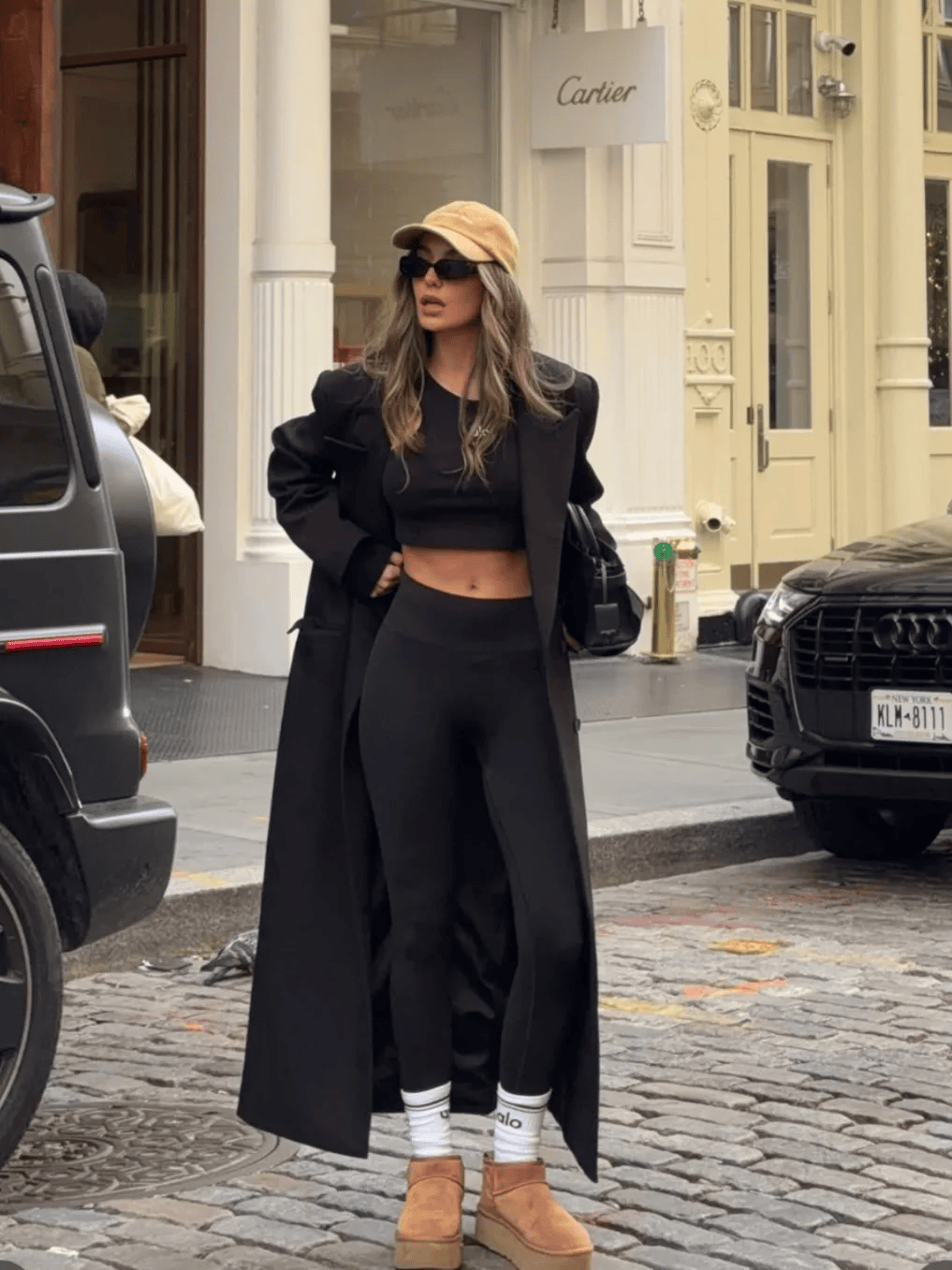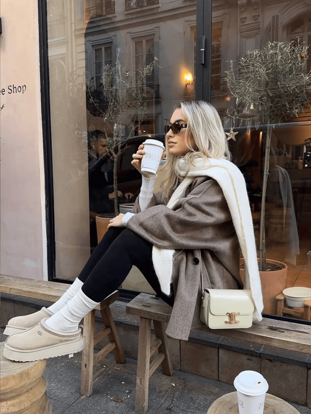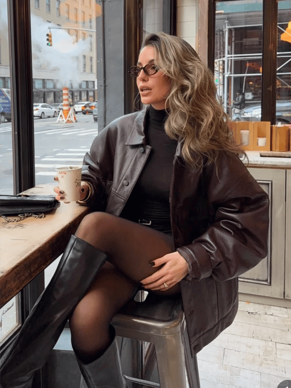 公式:oversize外套(羽绒服、大衣、针织开衫)+紧身裤(鲨鱼裤、牛仔裤)+长靴/短靴。