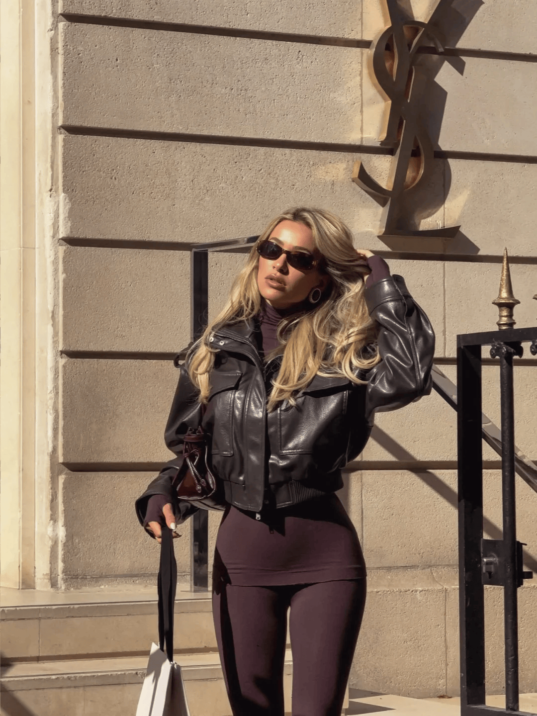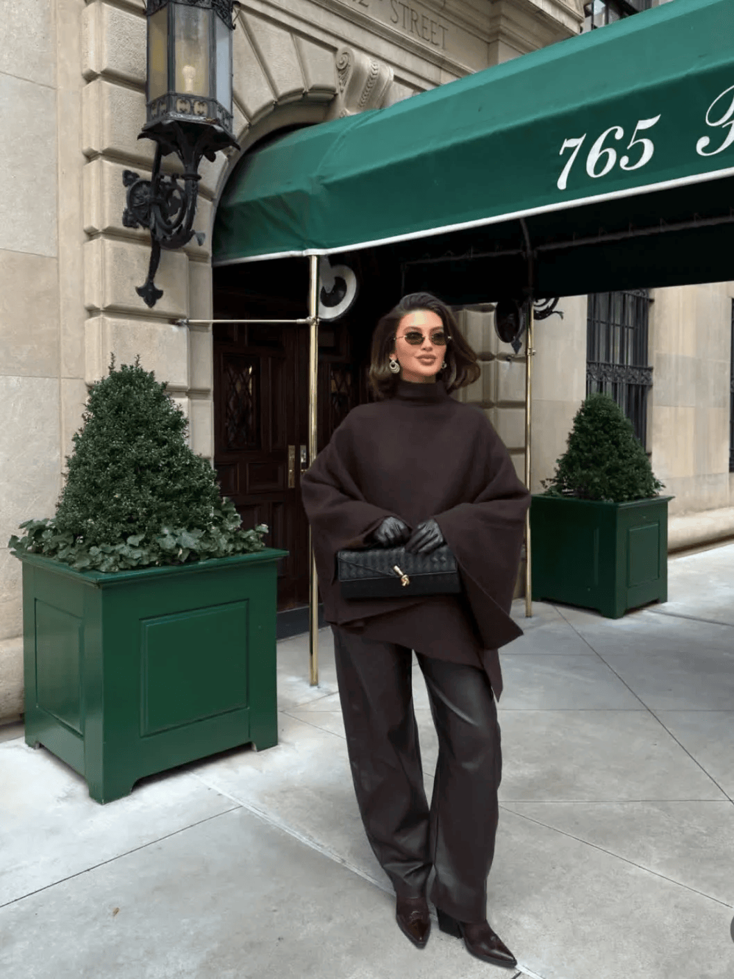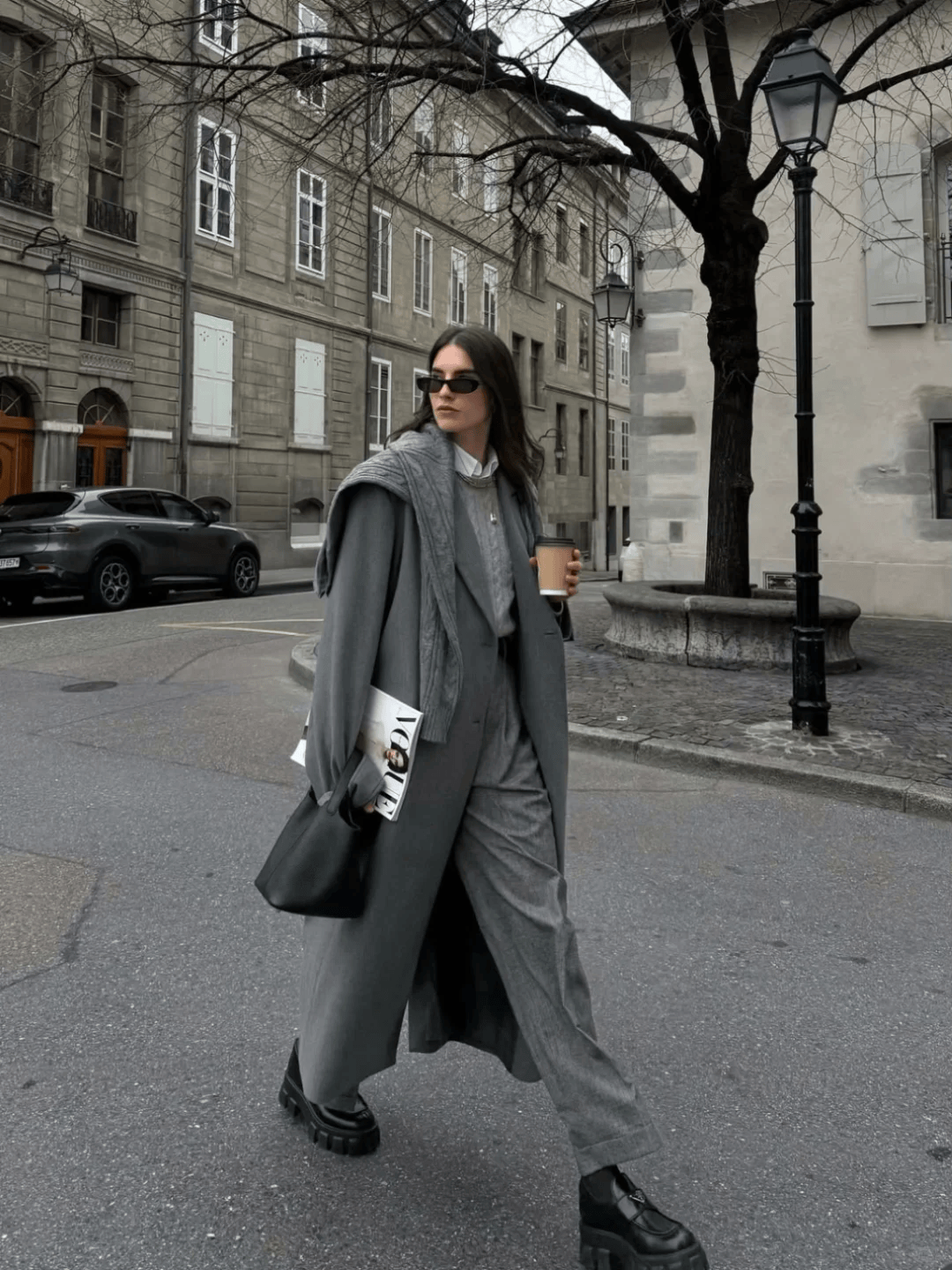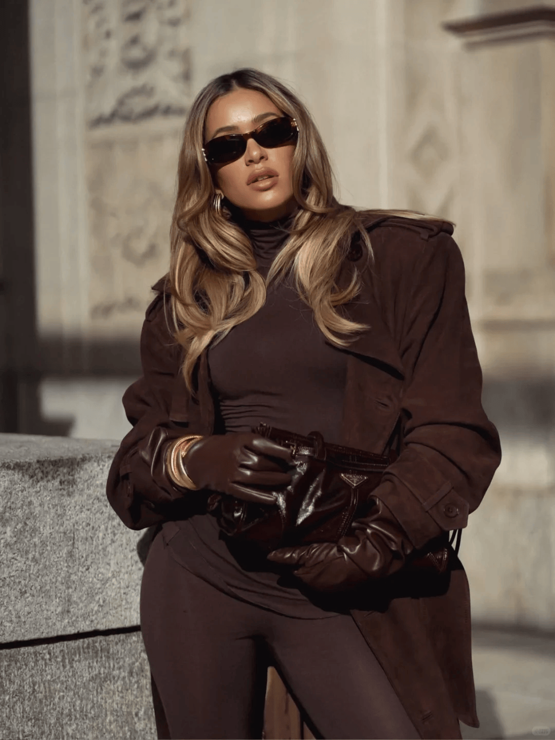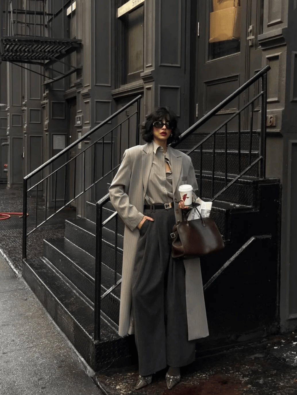 公式:长款外套(及膝或更长)+迷你包(手提包、斜挎包)。