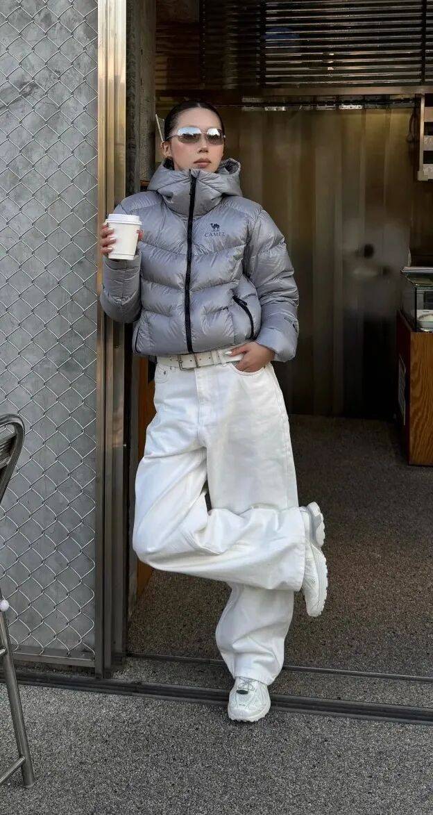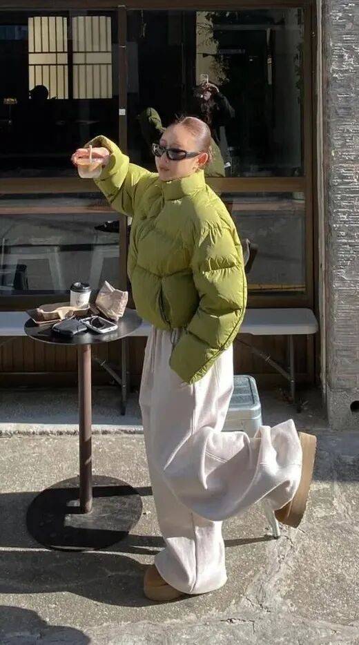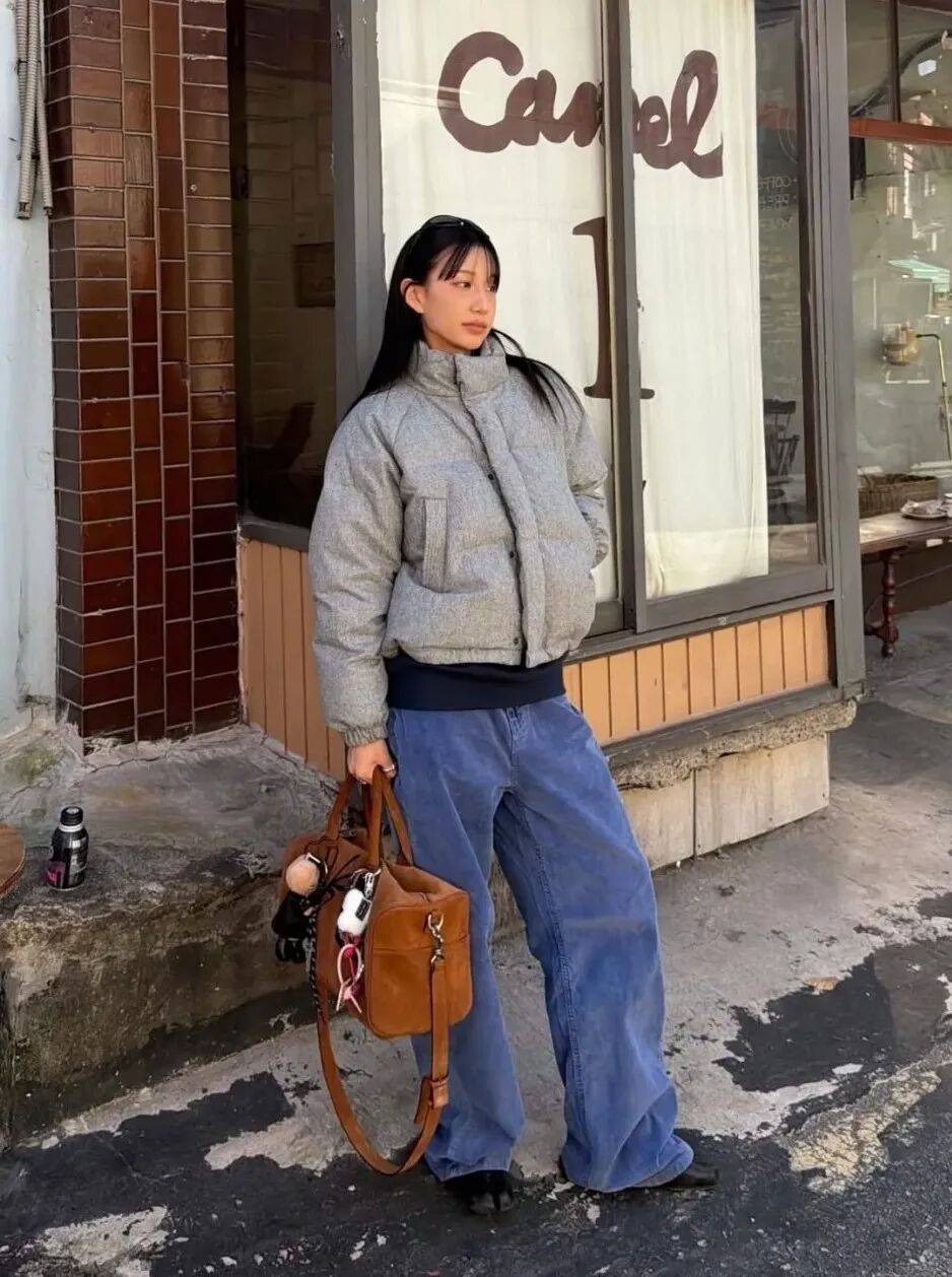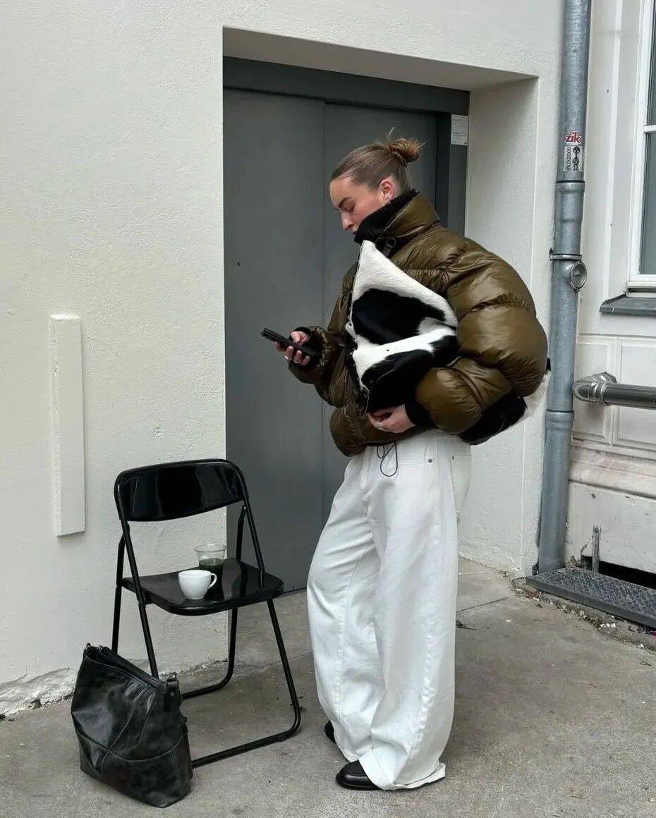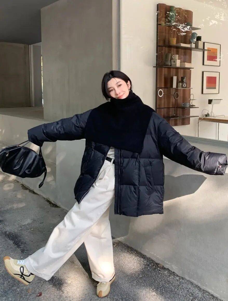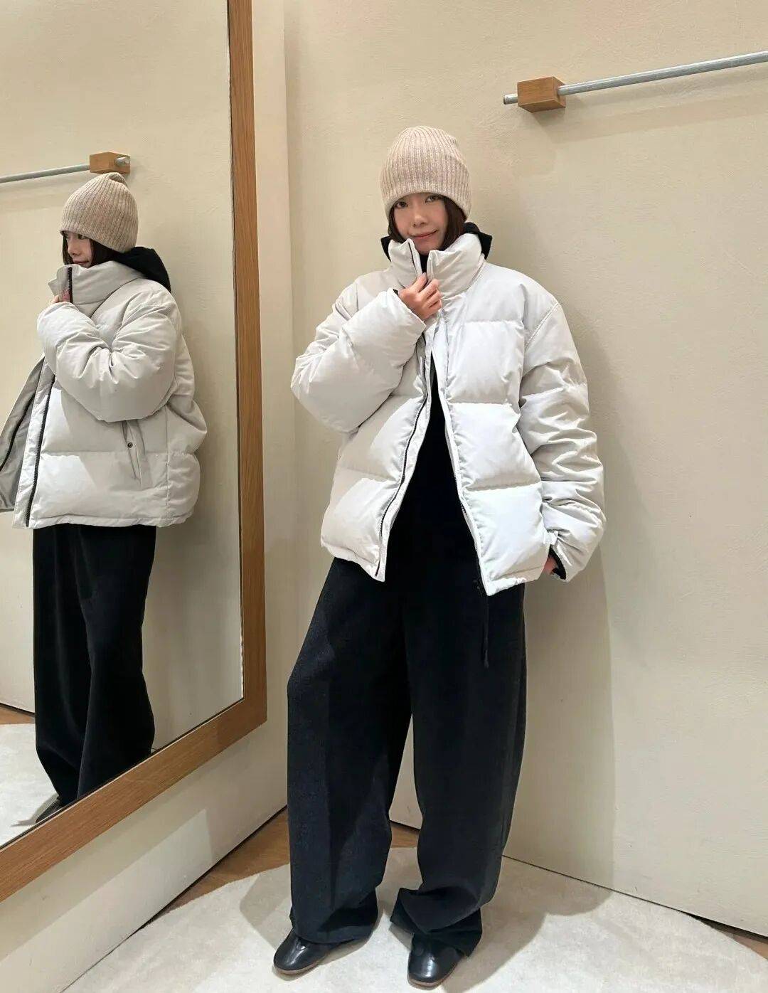 搭配面包服,是韩系博主最爱的松弛感组合,面包服优先挑奶油白、浅卡其、雾霾蓝等低饱和色,和白色阔腿裤顺色搭配,视觉上更显轻盈。