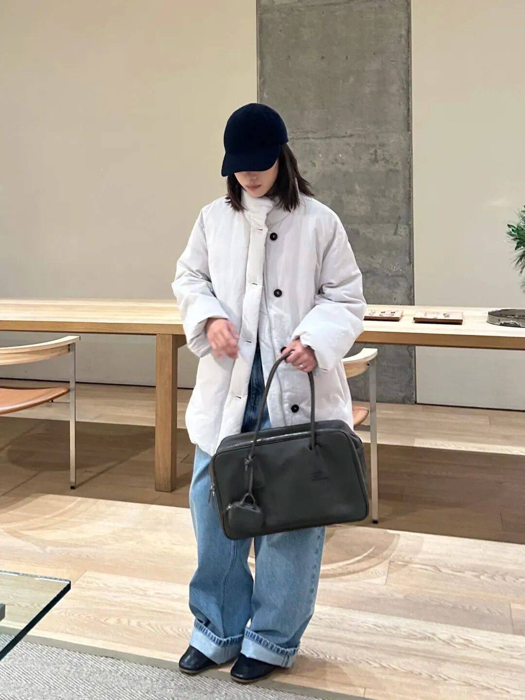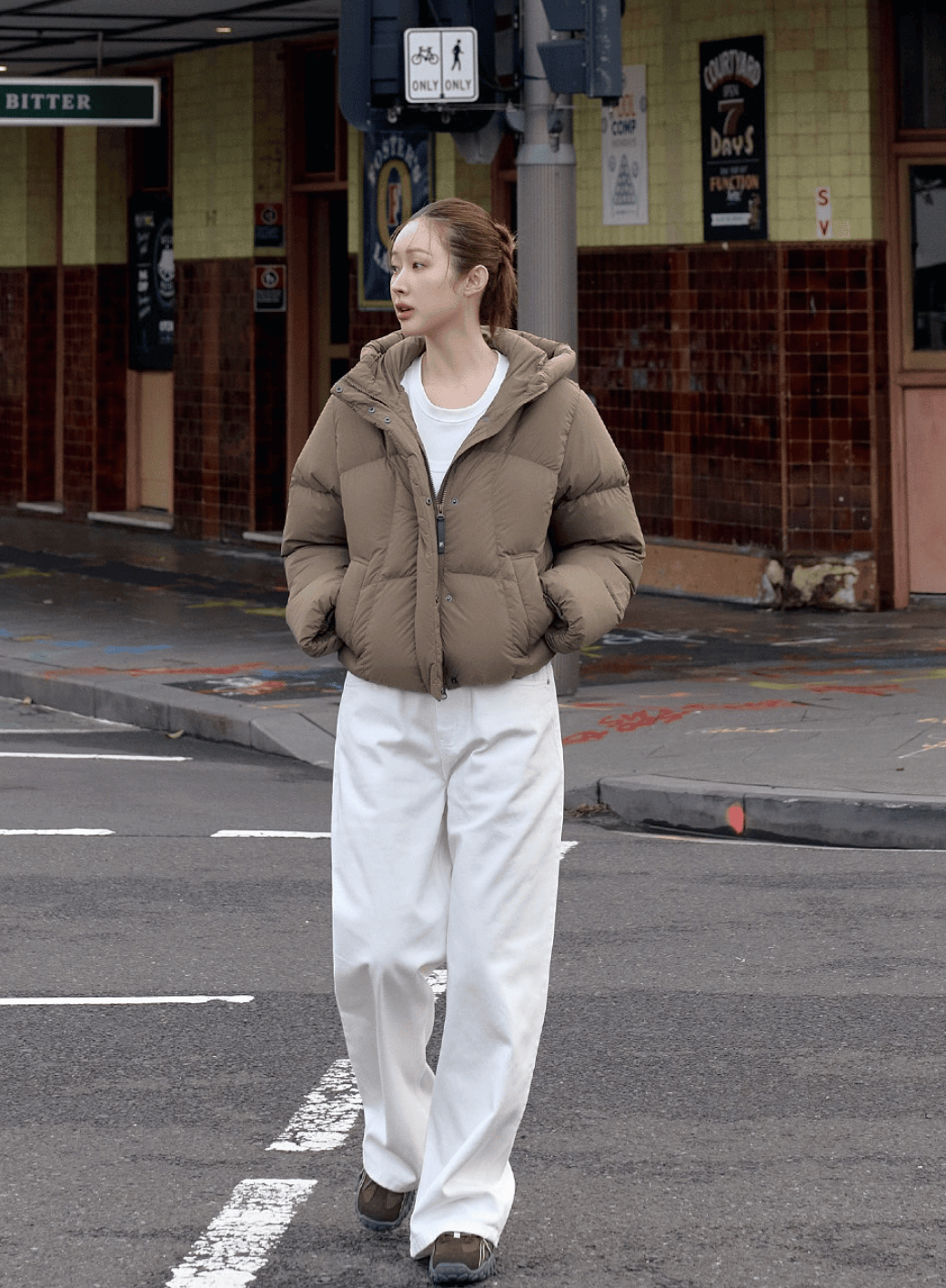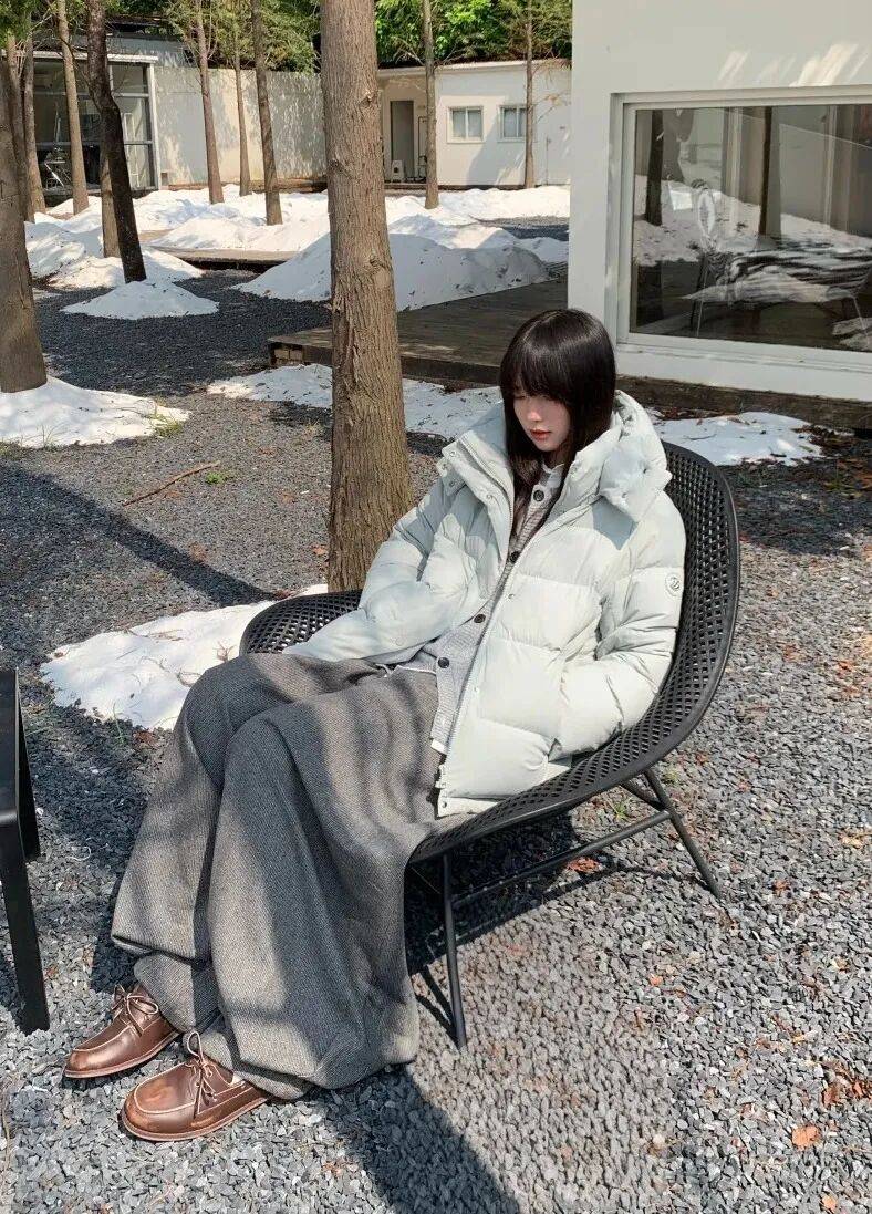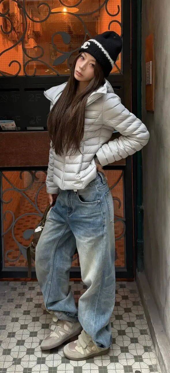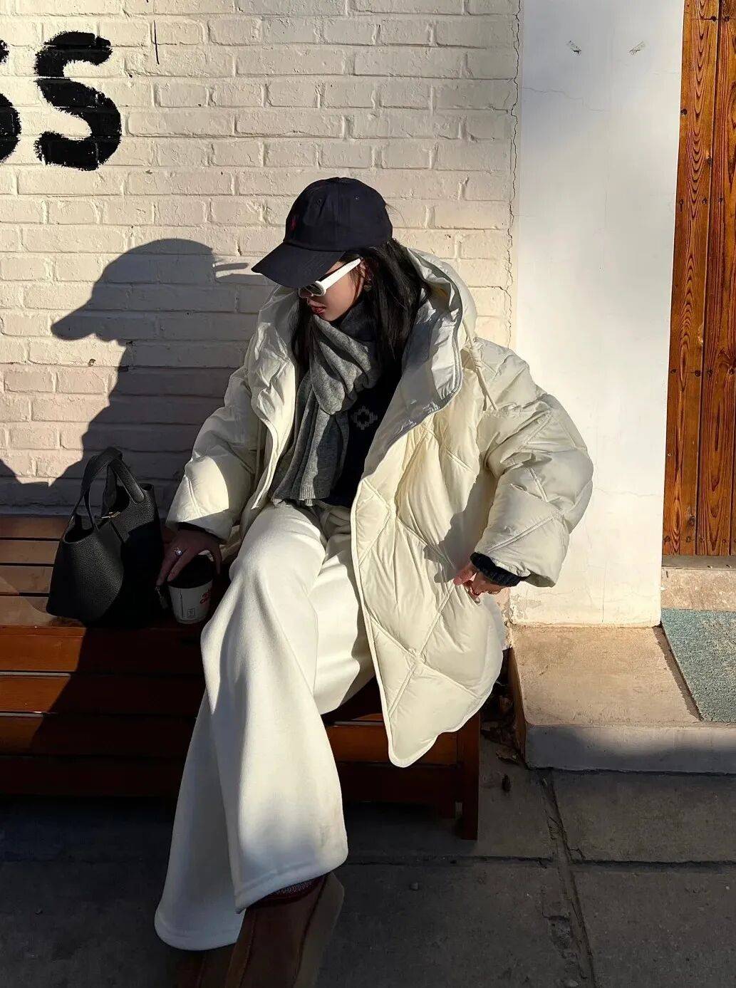 搭配面包服,是韩系博主最爱的松弛感组合,面包服优先挑奶油白、浅卡其、雾霾蓝等低饱和色,和白色阔腿裤顺色搭配,视觉上更显轻盈。