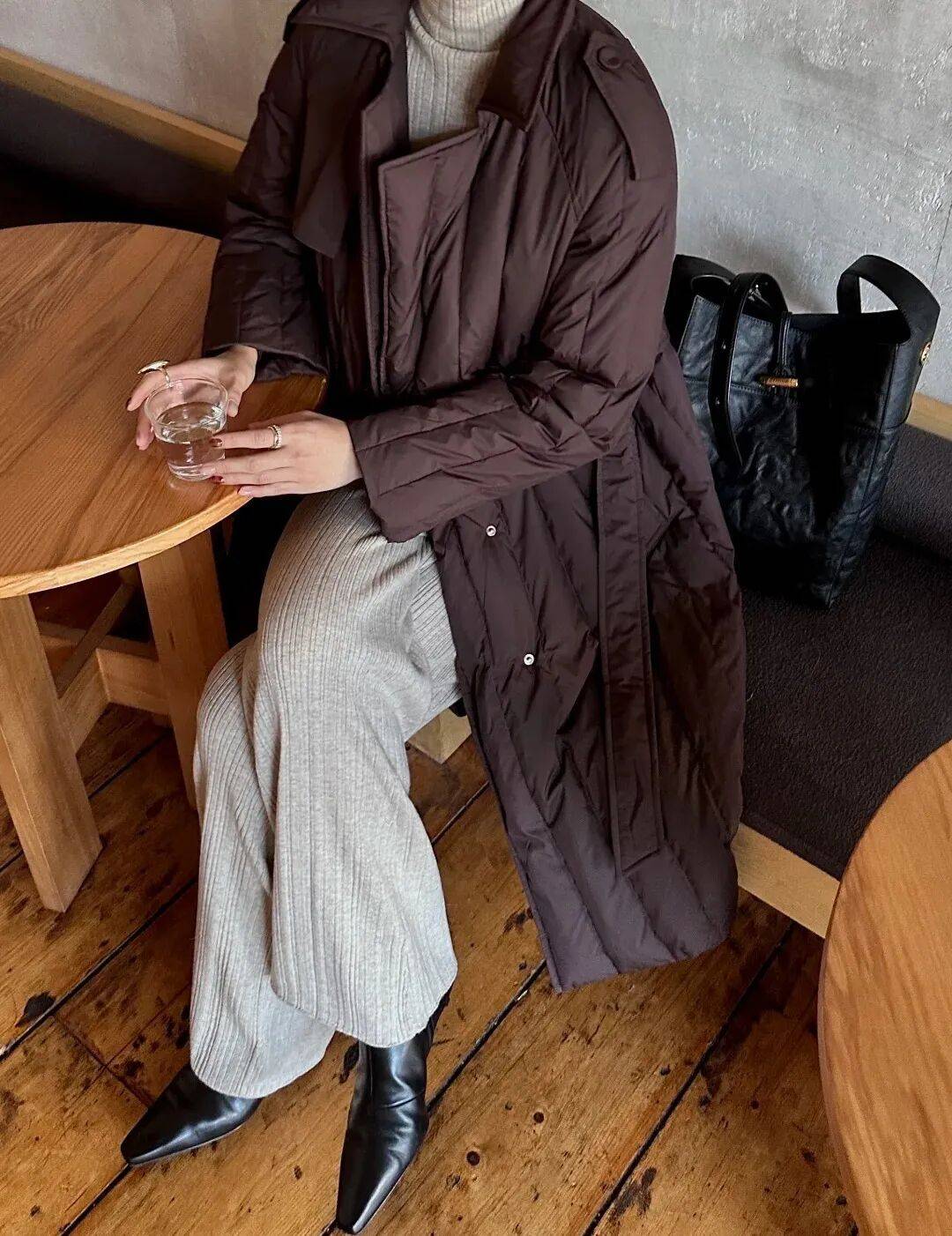 棕色长款羽绒服沉稳内敛,燕麦色内搭与阔腿裤温柔柔和。