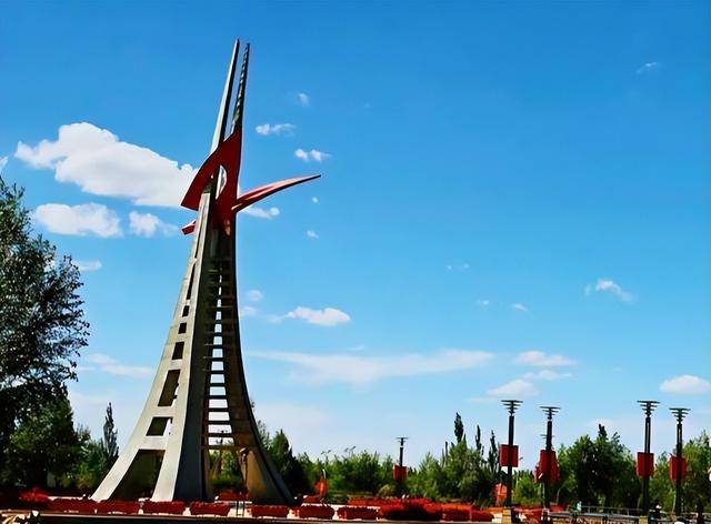 | 图片6 | 高耸塔状雕塑,顶部红色造型,周围绿植红饰,蓝天白云 | 或为纪念性建筑,象征城市发展高度与希望 |