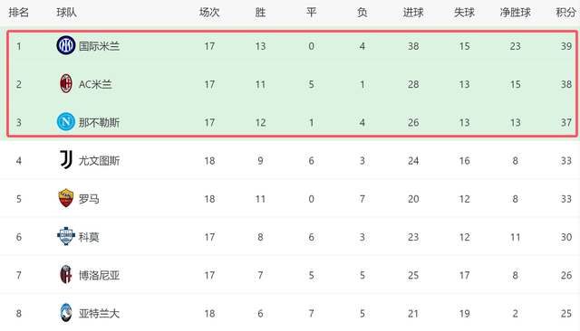 内容:国米39分第一,AC米兰38分第二,那不勒斯37分第三