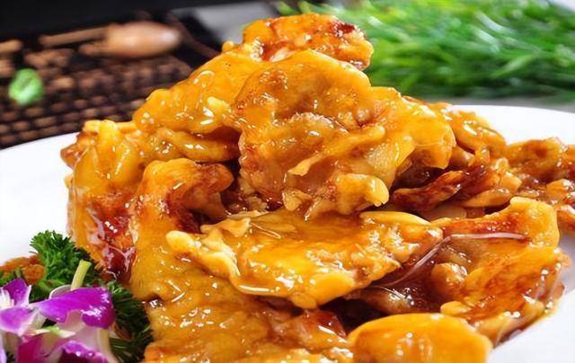 | 锅包肉(推测为图中金黄酱汁菜) | ✅ 是 | 图片7 | 金黄菜肴覆浓稠酱汁,点缀紫绿花朵 → 可能为锅包肉或类似糖醋类 |