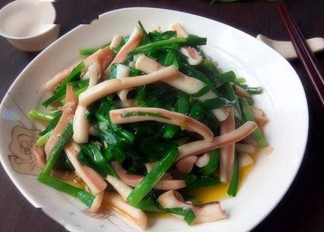 | 9 | 韭菜鱿鱼条 | 鱿鱼炒韭菜 | 韭菜+鱿鱼+黄油汁 |