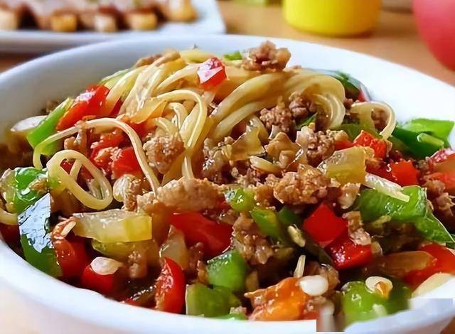 | 14 | 肉末面条 | 双椒肉拌面 | 面条+肉末+红绿椒 |