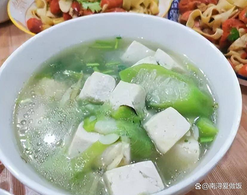 1. 丝瓜去皮滚刀块,泡在淡盐水中防氧化变黑,豆腐轻轻切块备用。
