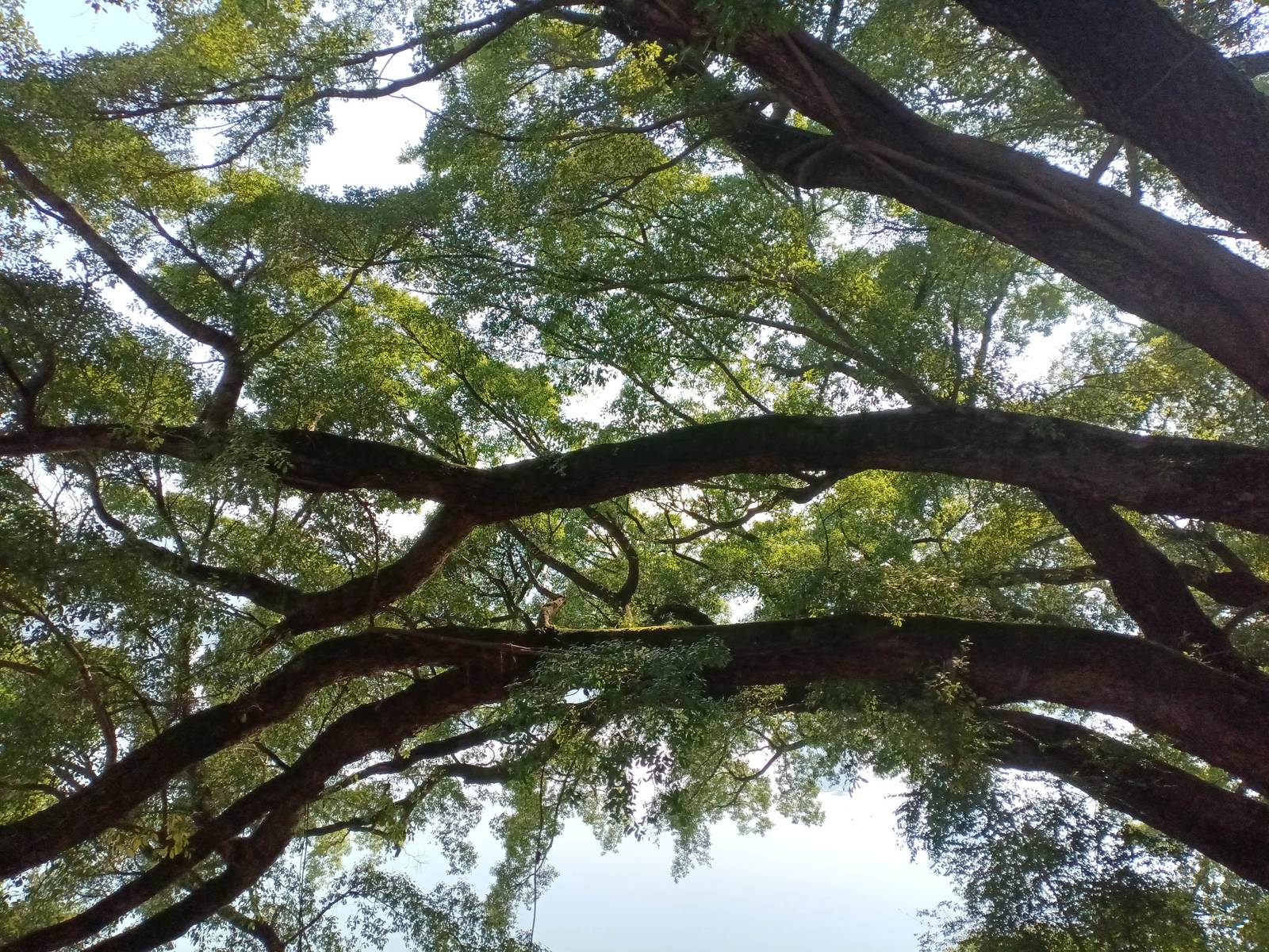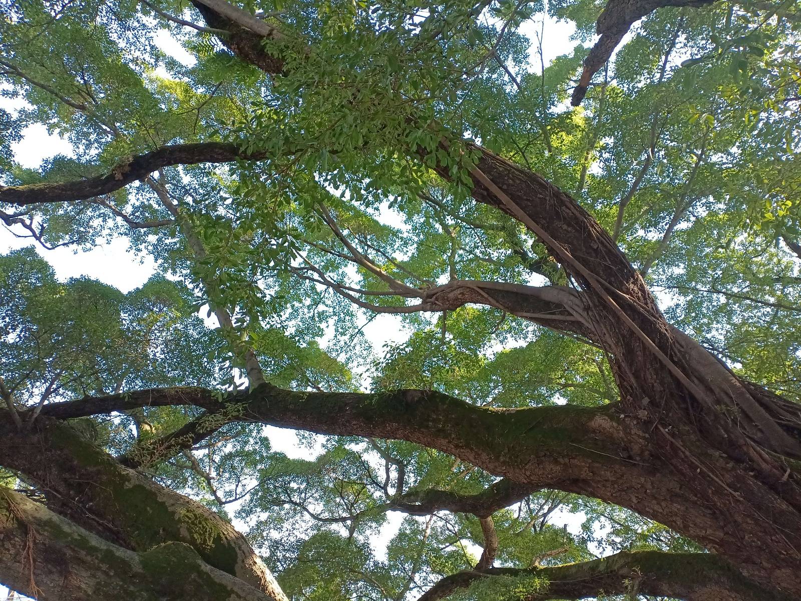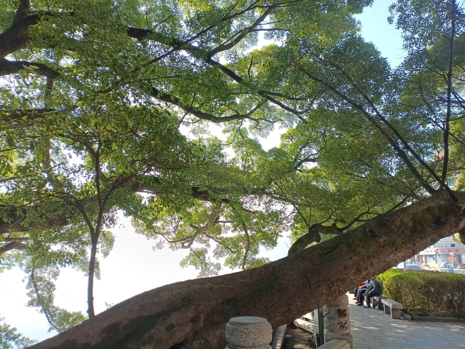 树冠:巨大的树冠如同一把撑开的绿伞,枝叶繁茂,四季常青。春天,新芽萌发,带来勃勃生机;夏天,浓密的枝叶为人们遮挡炎炎烈日,成为天然的纳凉胜地;秋天,部分叶子泛黄,与依旧翠绿的枝叶相互映衬,别有一番风味;冬天,它依然傲立,为寒冷的季节增添一抹绿色。