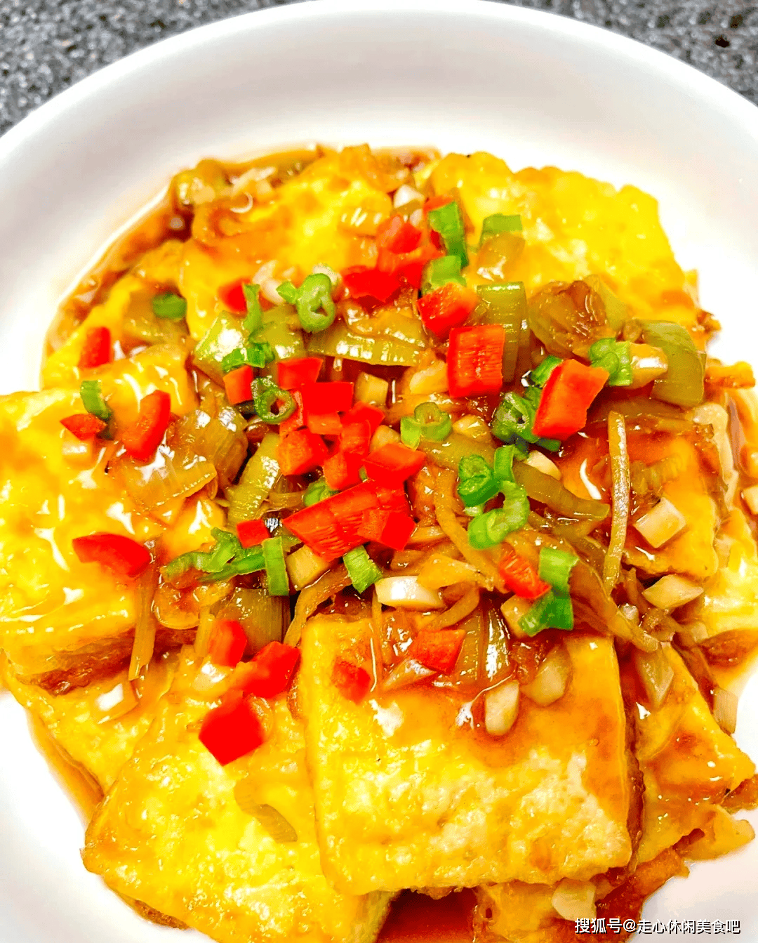1. 老豆腐切厚片,裹蛋液煎至两面金黄。