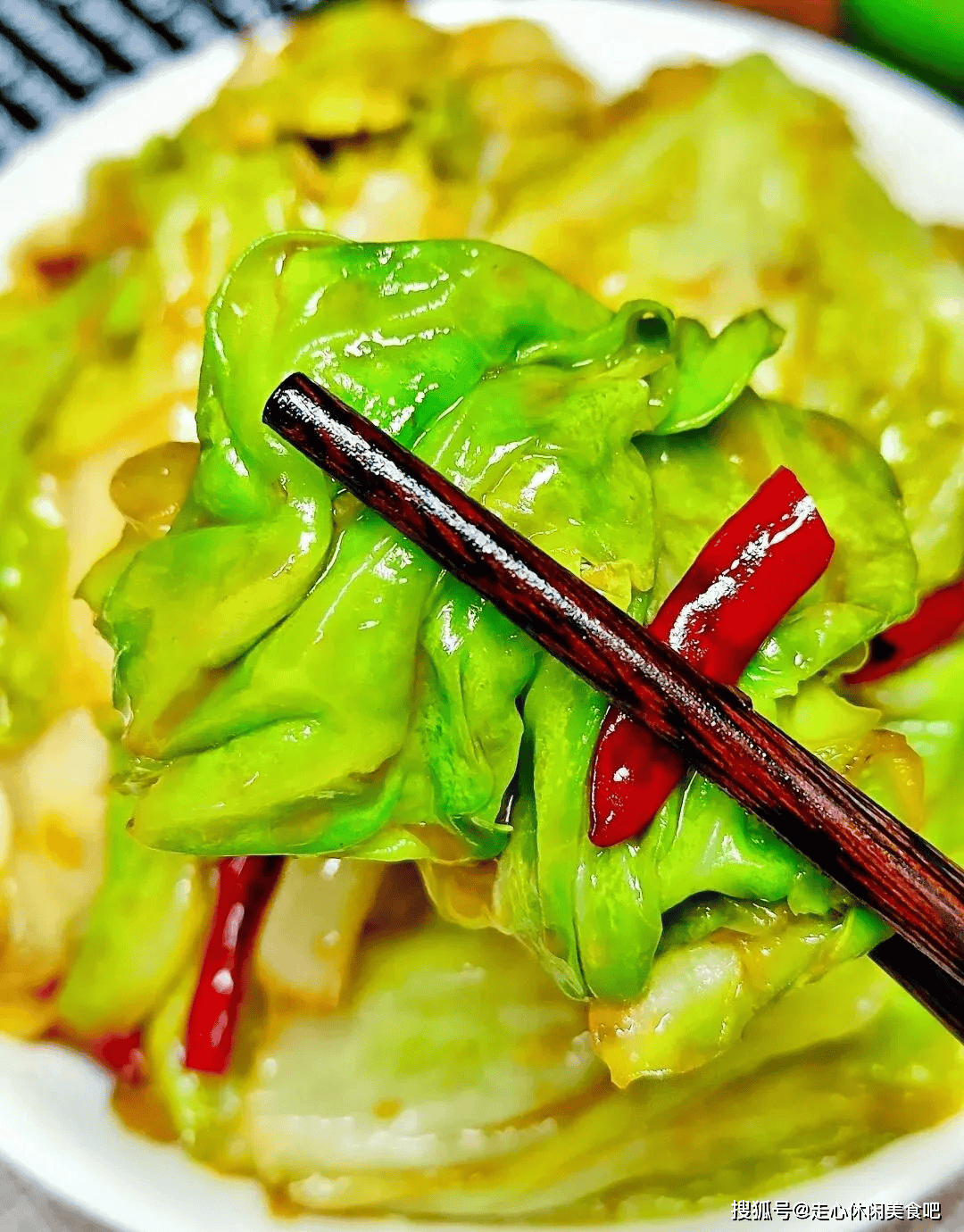 2. 干辣椒、蒜片爆香,包菜大火爆炒30秒。