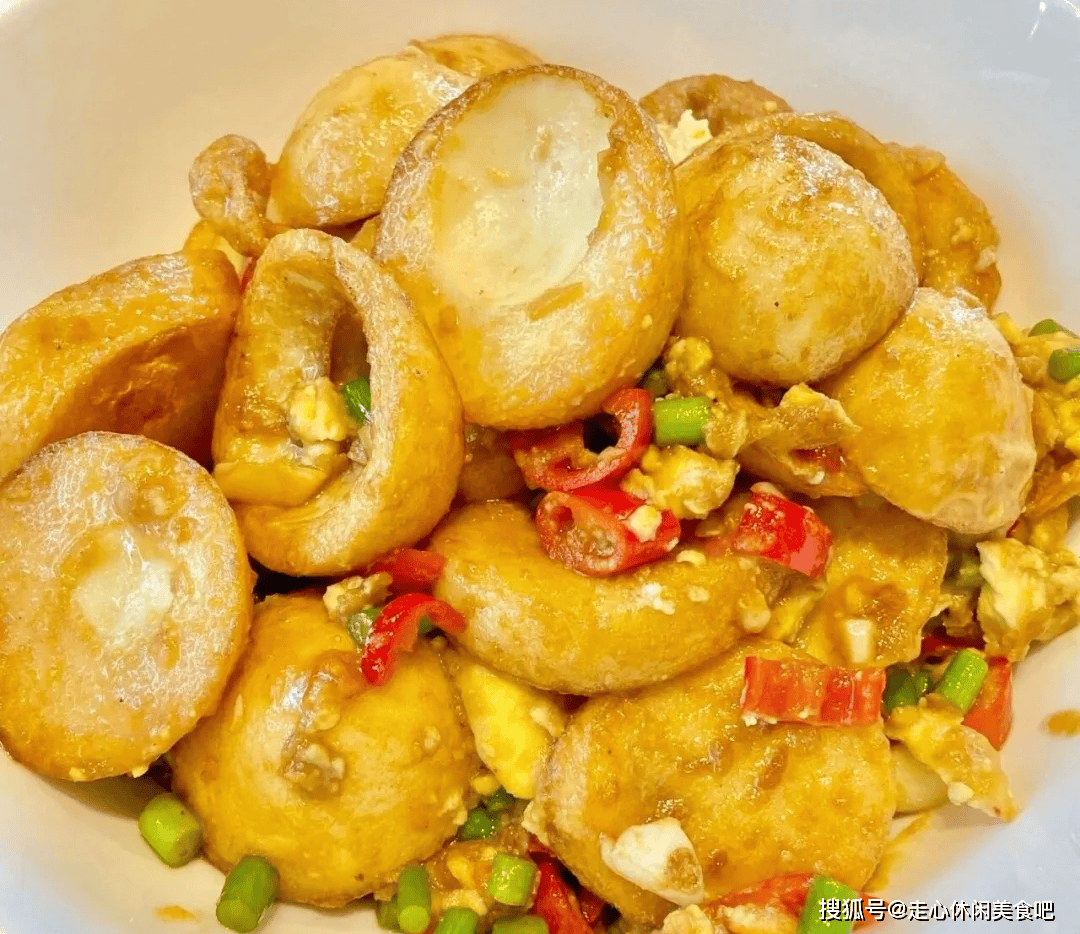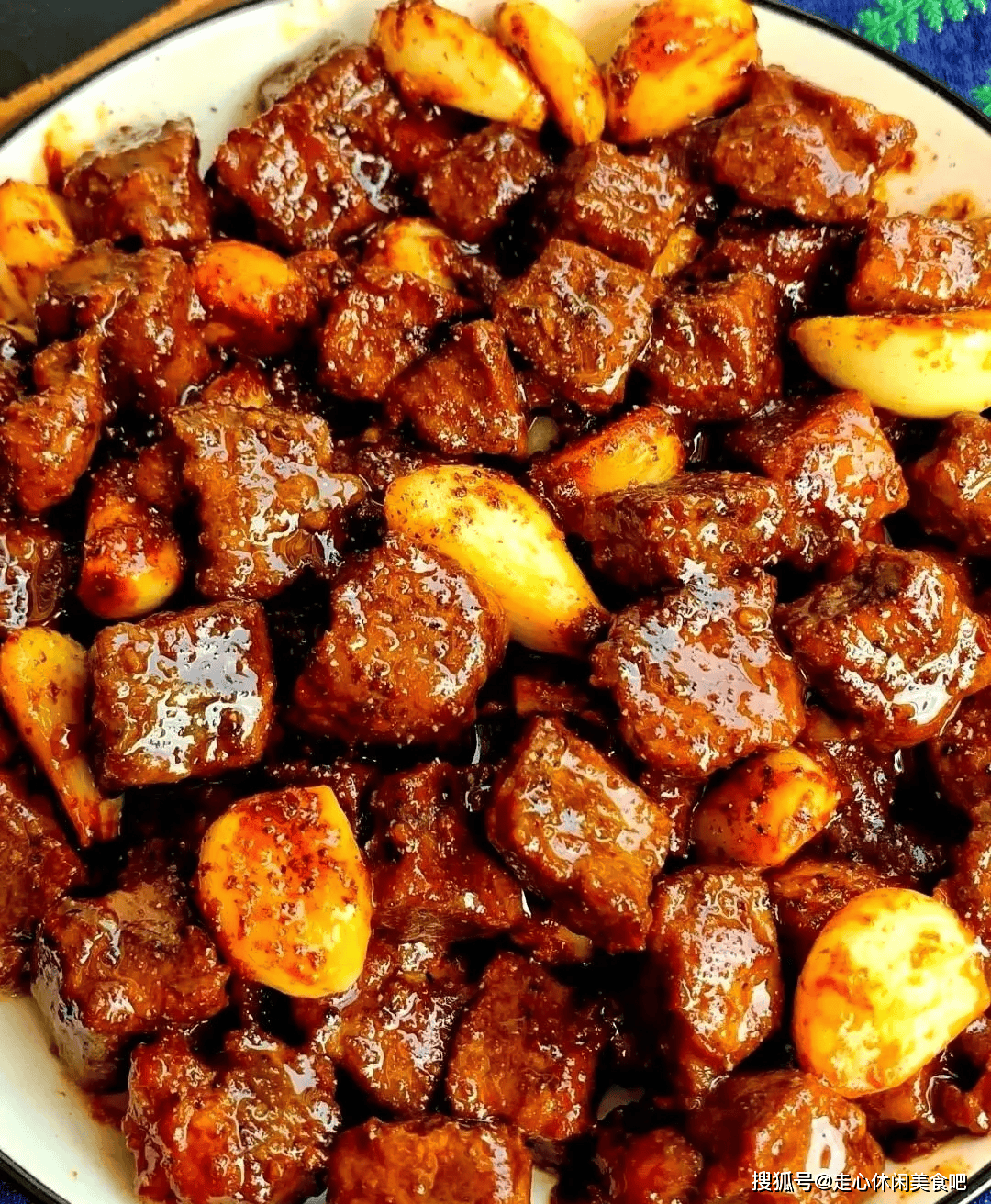整颗蒜瓣炸至金黄捞出,余油爆香牛肉粒