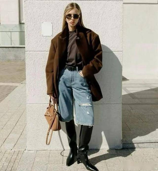 廓型的咖色西装,慵懒硬朗的中性风格,配上帅气的牛仔七分裤,很个性洒脱的样子,配上高筒靴,随性大气又利落清爽。