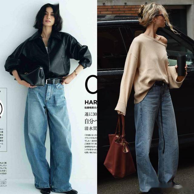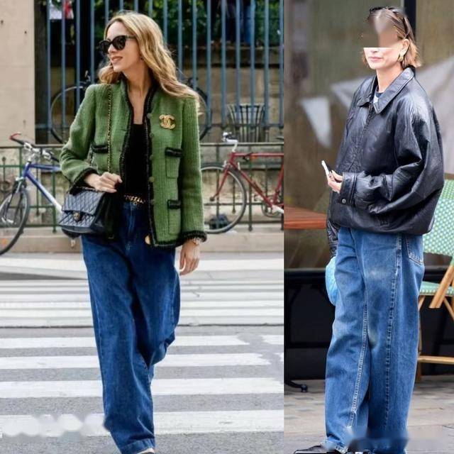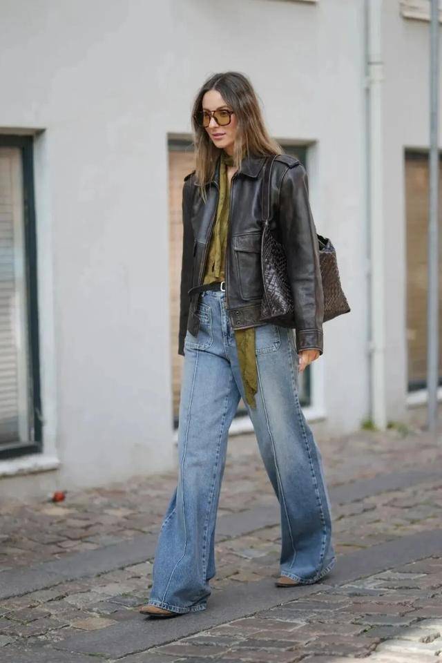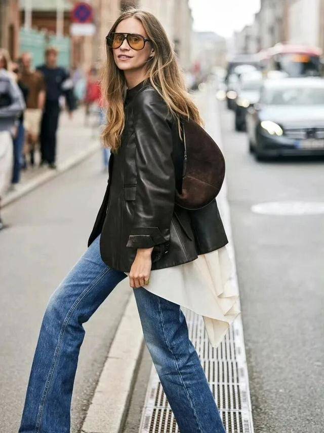 短外套与牛仔阔腿裤更适配,尤其是今年春季非常流行的皮夹克搭配牛仔阔腿裤,真的又帅又酷。