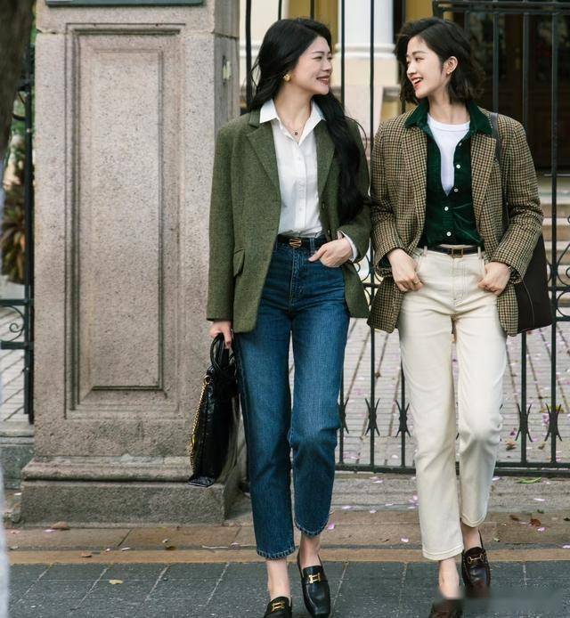 简约利落的西装,选择爽利的九分牛仔裤,配上乐福鞋,露出一截脚踝显得腿长了一截,整体H型的造型,更显得人修长干练,非常适合日常通勤。