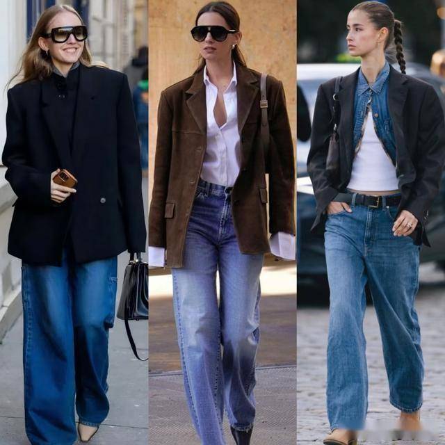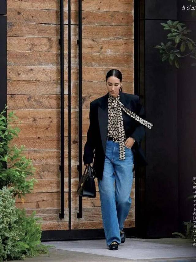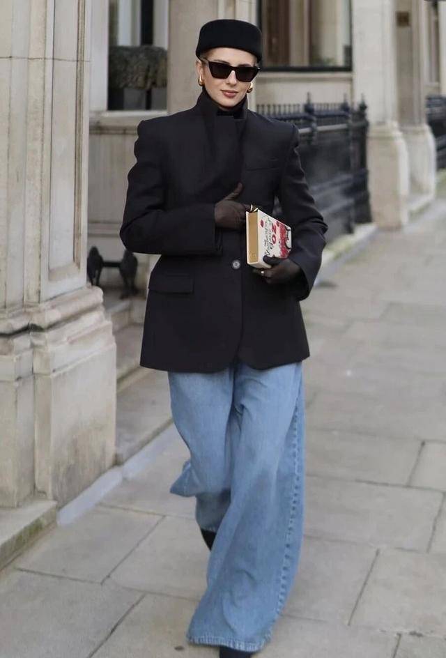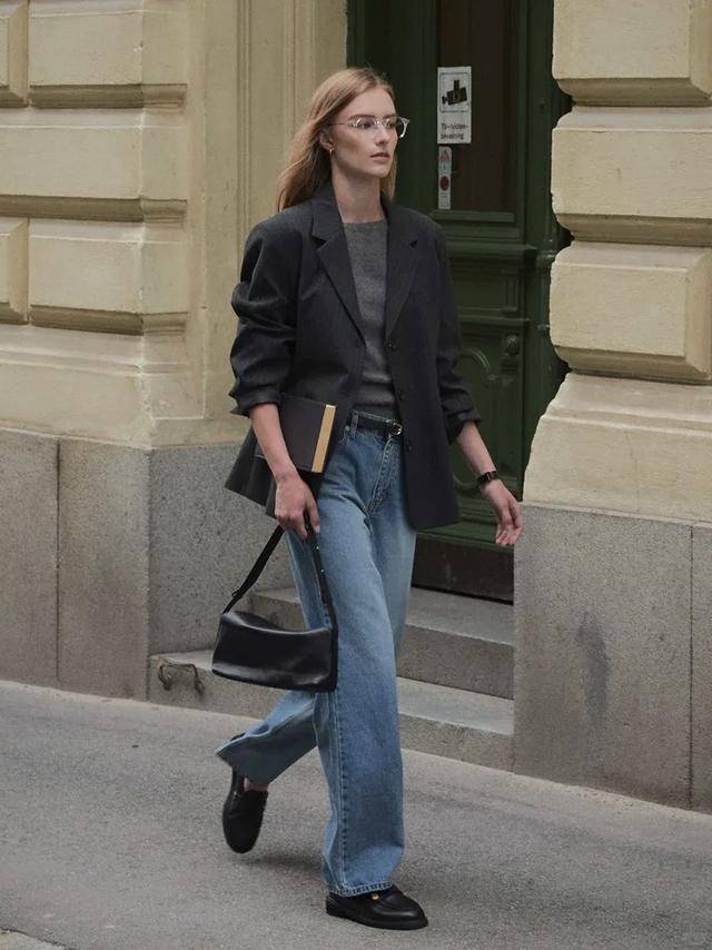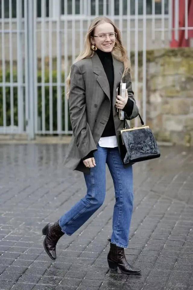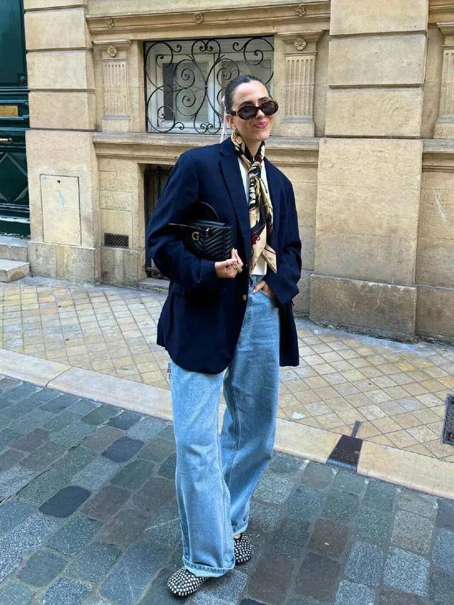 西装廓形宜稍显松阔,避免拘谨。内搭一件休闲t恤或者加一条丝巾带出灵动飘逸感,下配蓝色直筒牛仔裤,便是冬日街头一道率性而自在的风景。