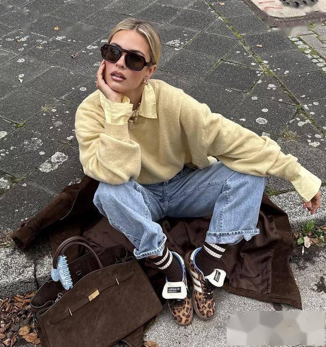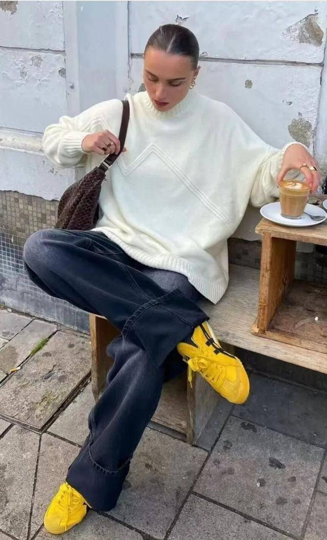 一件米白色的羊绒毛衣松软覆身,搭配一条深色的牛仔阔腿裤,加一双亮色的运动鞋,足下瞬间添彩,慵懒惬意的分寸感恰到好处。